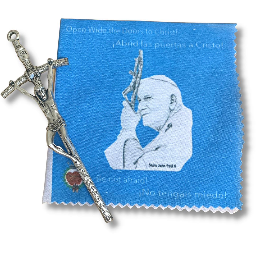 A silver crucifix modeled after the crozier used by our beloved St. John Paul II. This crucifix is versatile for both small and medium rooms and can be hung over beds or in offices for inspiration. It is perfect gift for devotees of St. John Paul II.