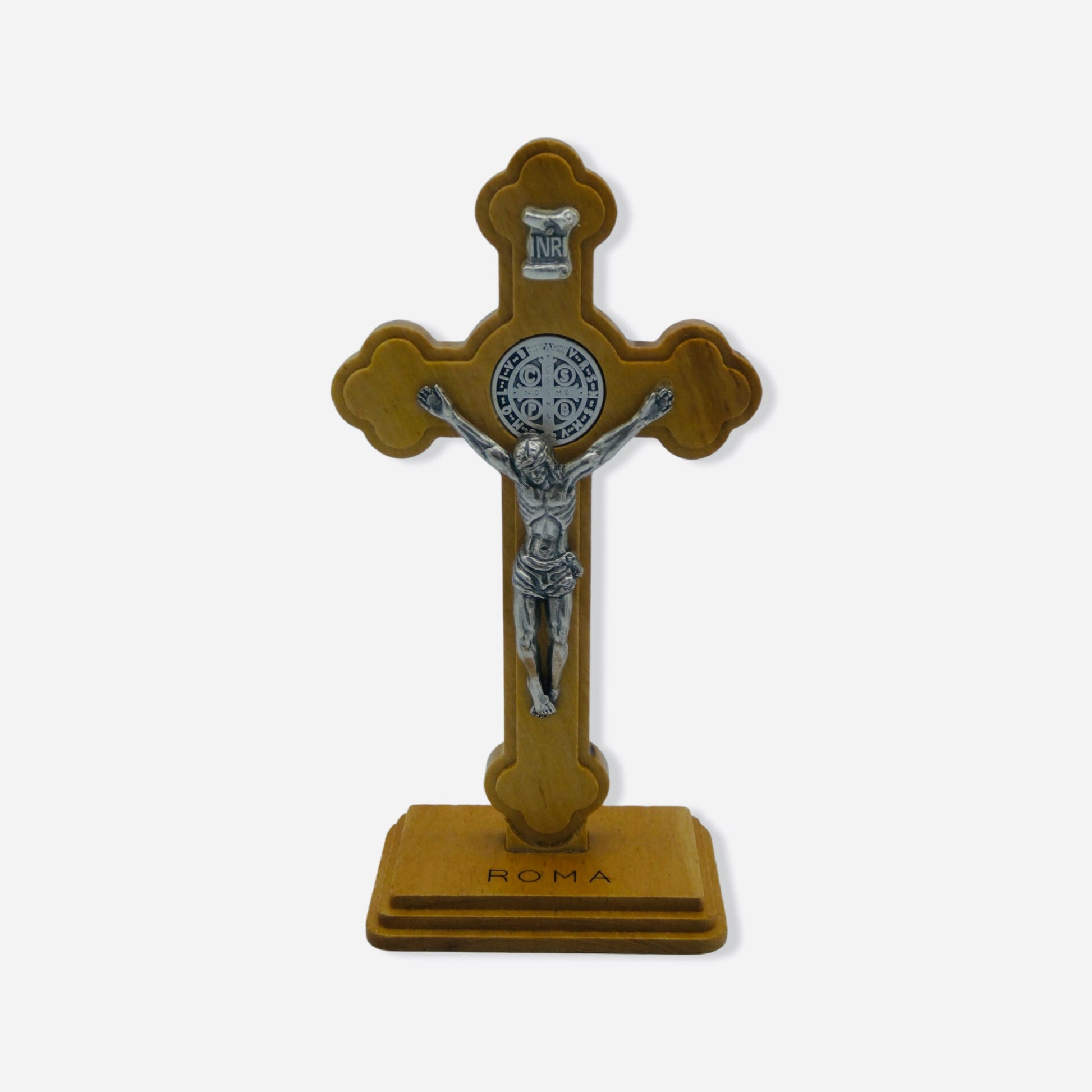 A small standing chestnut stained wood cross upon which hangs a silver corpus. The traditional Christian cross is accented with bud-shaped beams. A silver St. Benedict medal is set where the crossbeams meet. A powerful sacramental of the Church, the St. Benedict crucifix, when exorcized and blessed, brings a particular protection of the home where it is placed against evil as well as a particular presence of Christ himself. This crucifix is a perfect size for a small desk or night table, bringing the presence of Christ and His protection. These crucifixes are purchased for our shop by our sisters who live and serve in the Heart of the Church in Mexico.