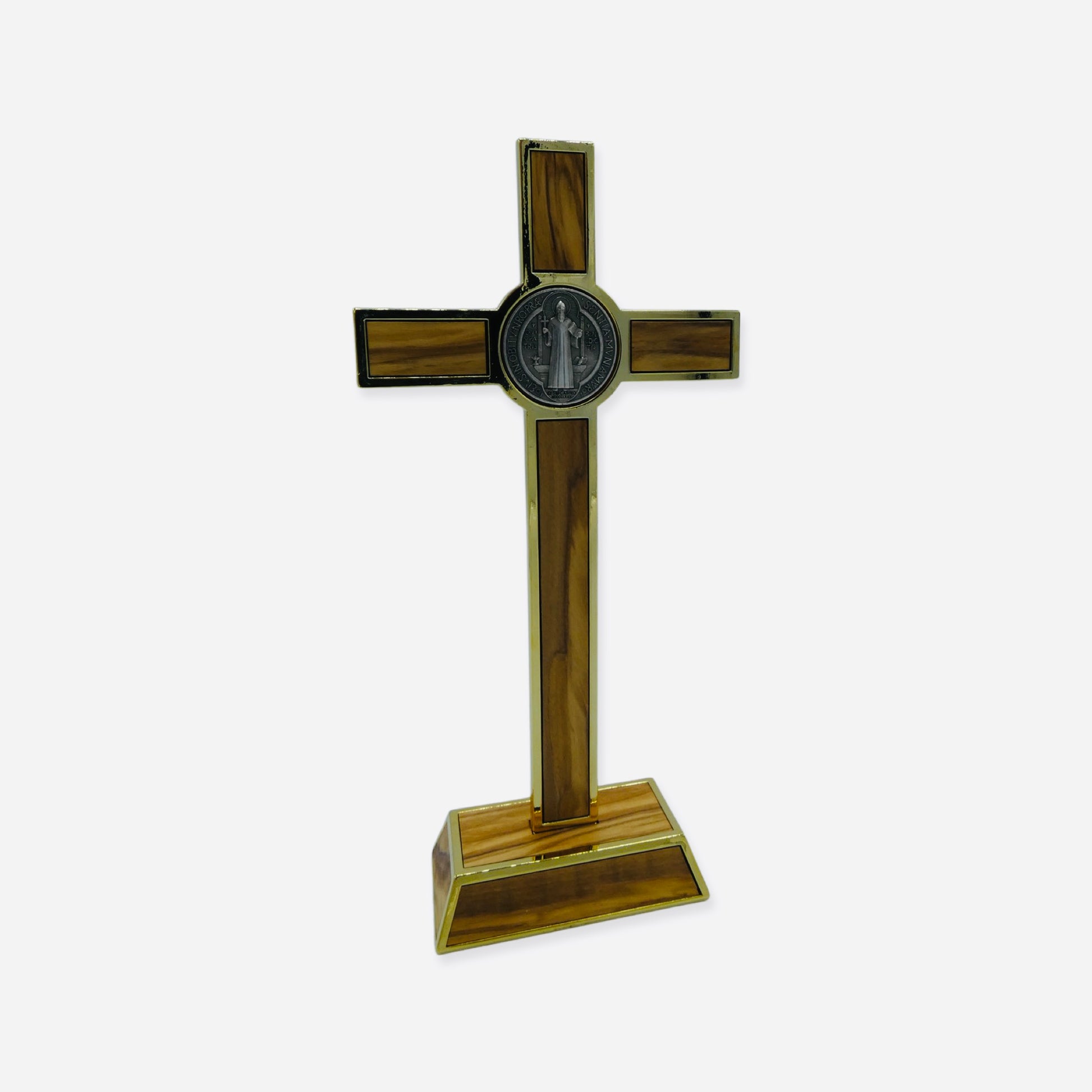 Gold Hickory Wood Colored Inlay St. Benedict Standing Crucifix