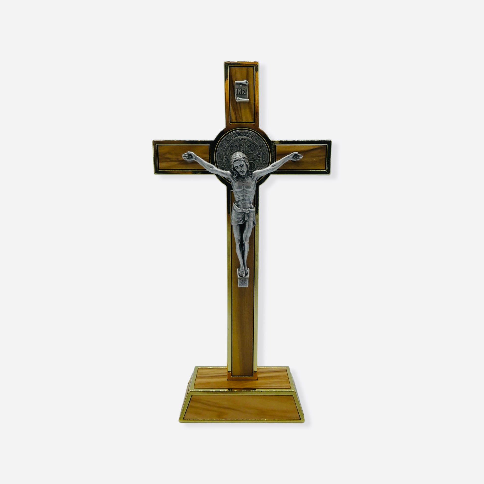 A standing traditional golden cross with hickory stained wood inlay upon which hangs a silver corpus. The crucifix stands on a small hickory wood colored and gold framed base to match the crucifix. A medium silver St. Benedict medal is set where the crossbeams meet. A powerful sacramental of the Church, the St. Benedict crucifix, when exorcized and blessed, brings a particular protection of the home where it is placed against evil as well as a particular presence of Christ himself. This crucifix is a perfect size for a desk or bookshelf, protecting the room or office and those who use it and evangelizing those who visit. These crucifixes are purchased for our shop by our sisters who live and serve in the Heart of the Church in Rome.