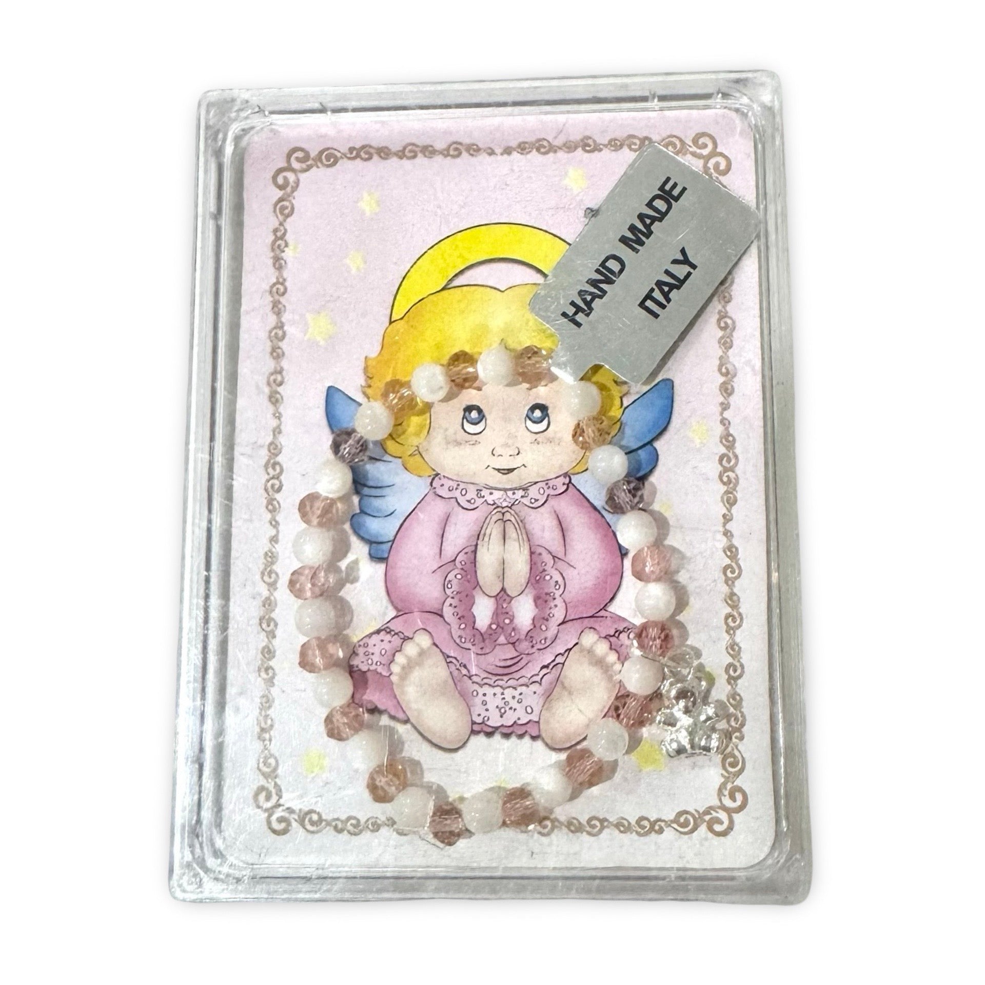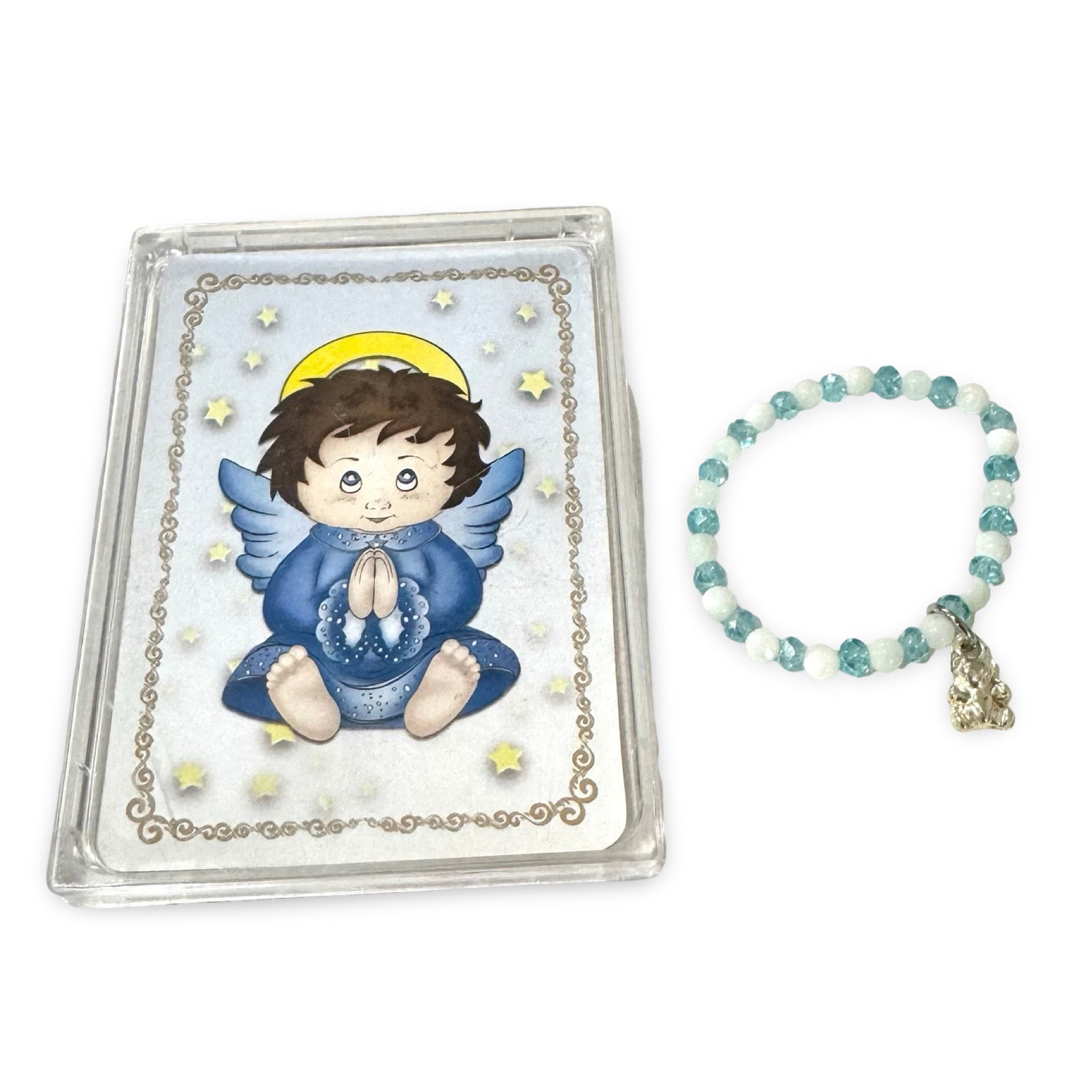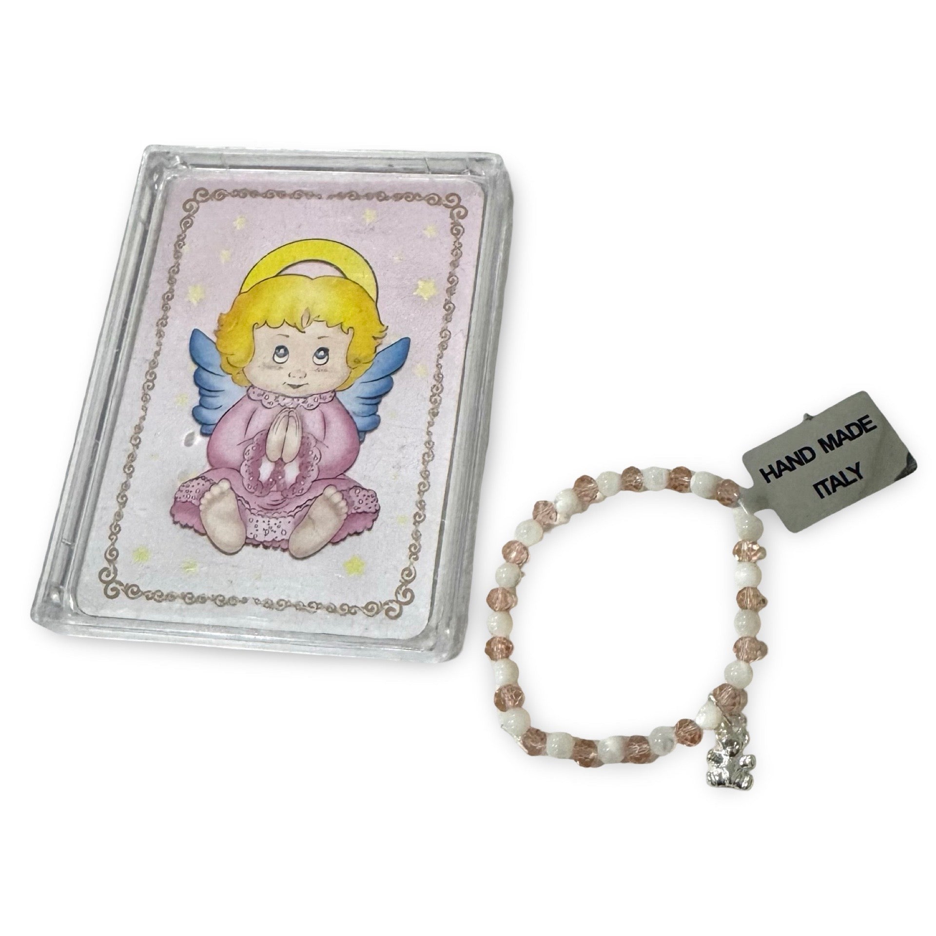 This beautiful colored baby bracelet with a teddy bear pendant is a great gift for a baptism or a baby shower. It comes in a case with a cute guardian angel holy card.