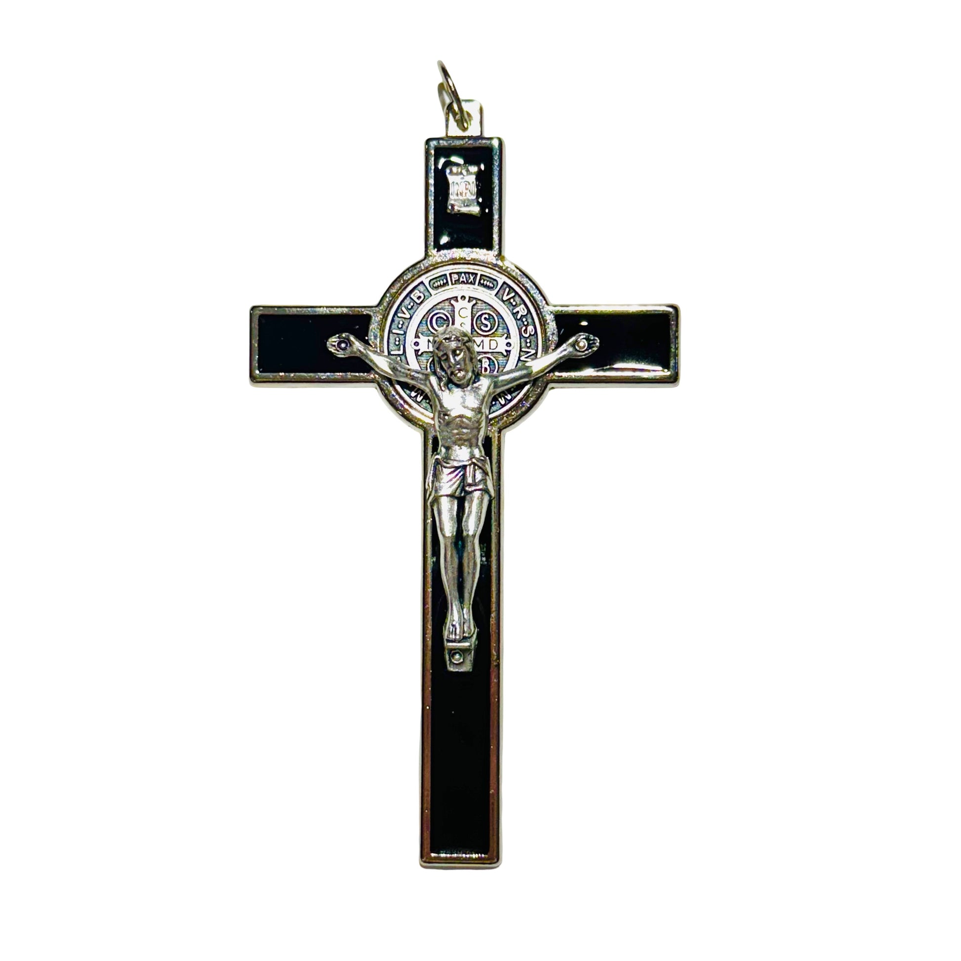 A black St. Benedict Crucifix with black inlay on the front and back and a silver corpus. It is a simple and traditional crucifix with a touch of elegance given by the silver border. A silver St. Benedict medal is set where the crossbeams meet. A powerful sacramental of the Church, the St. Benedict crucifix, when exorcized and blessed, brings a particular protection for the home where it is hung and for those who live or work there. This crucifix is suitable for a variety of rooms and purposes.