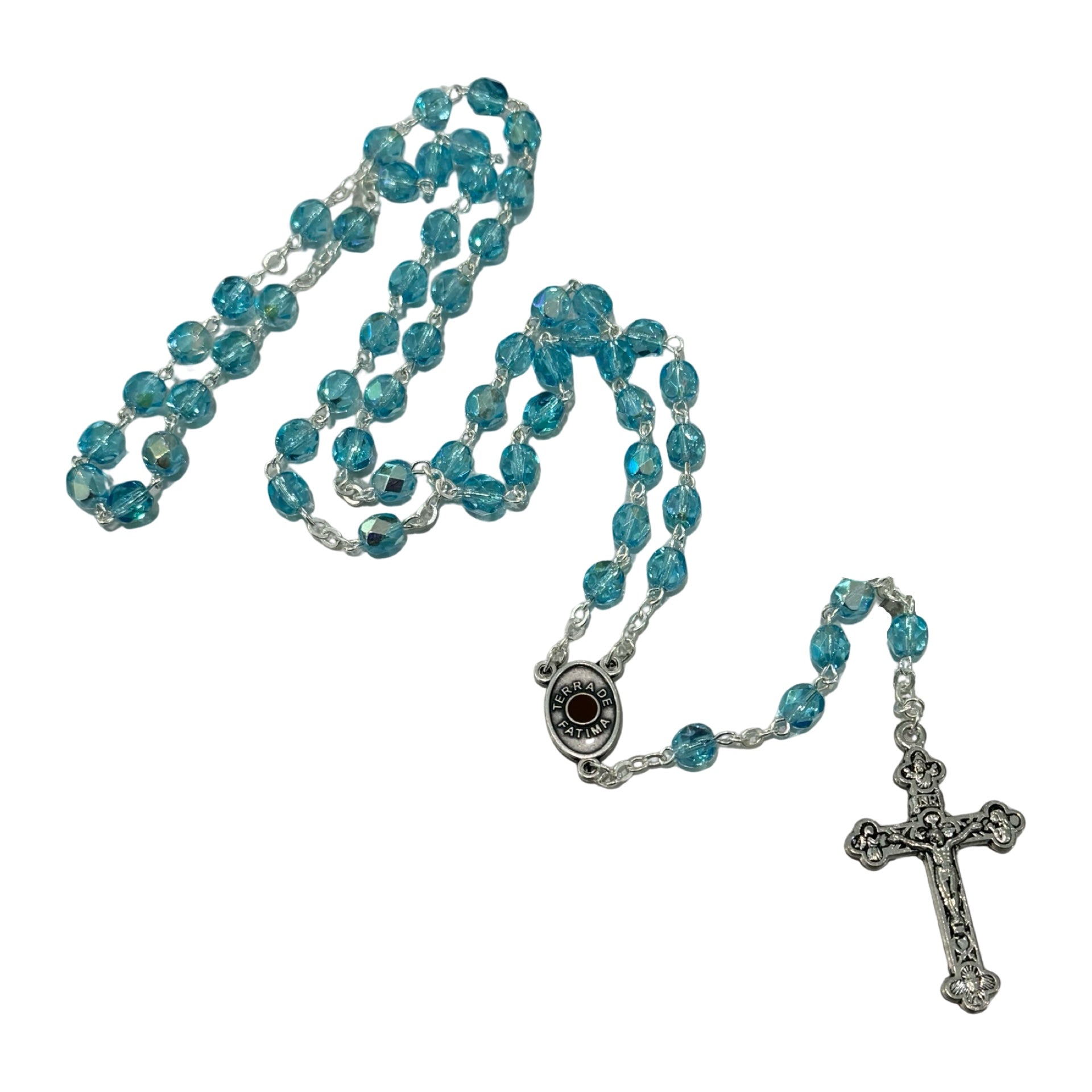 This crystal rosary was brought from Fatima and features soil from Fatima and a beautifully embellished crucifix.