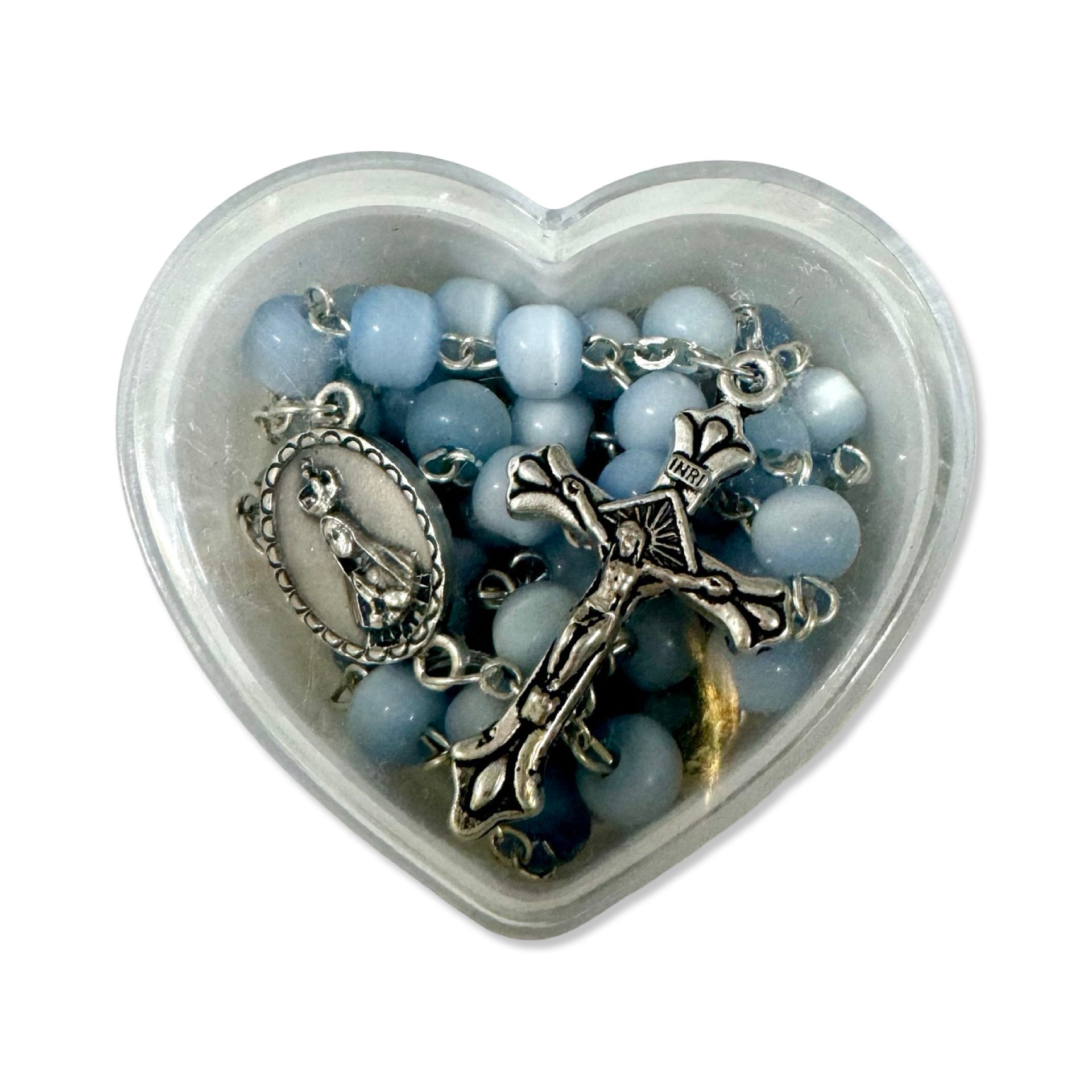Dimensions: This beautiful blue rosary has an embellished center medal of Our Lady Fatima and a beautiful crucifix. This rosary either comes with a holy card of your choice of language (Spanish or English), or a heart shaped case which is perfect to keep in your purse or backpack.