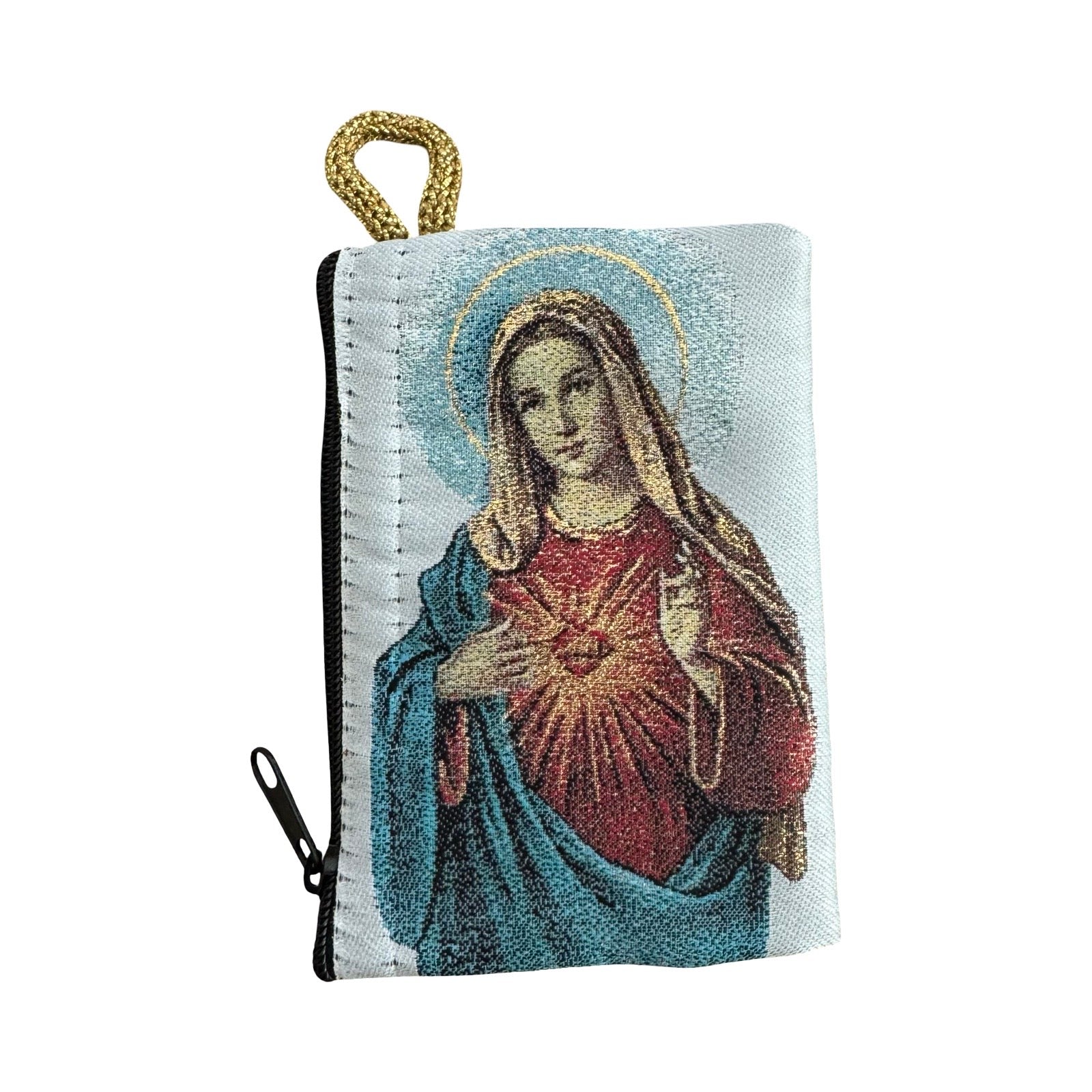 This Immaculate Heart of Mary pouch is perfect for holding prayer cards, rosaries, and other small devotional items. It fits well in a purse or can be used as a small handheld wallet. It bears the image of the Immaculate Heart of Mary on a blue background.