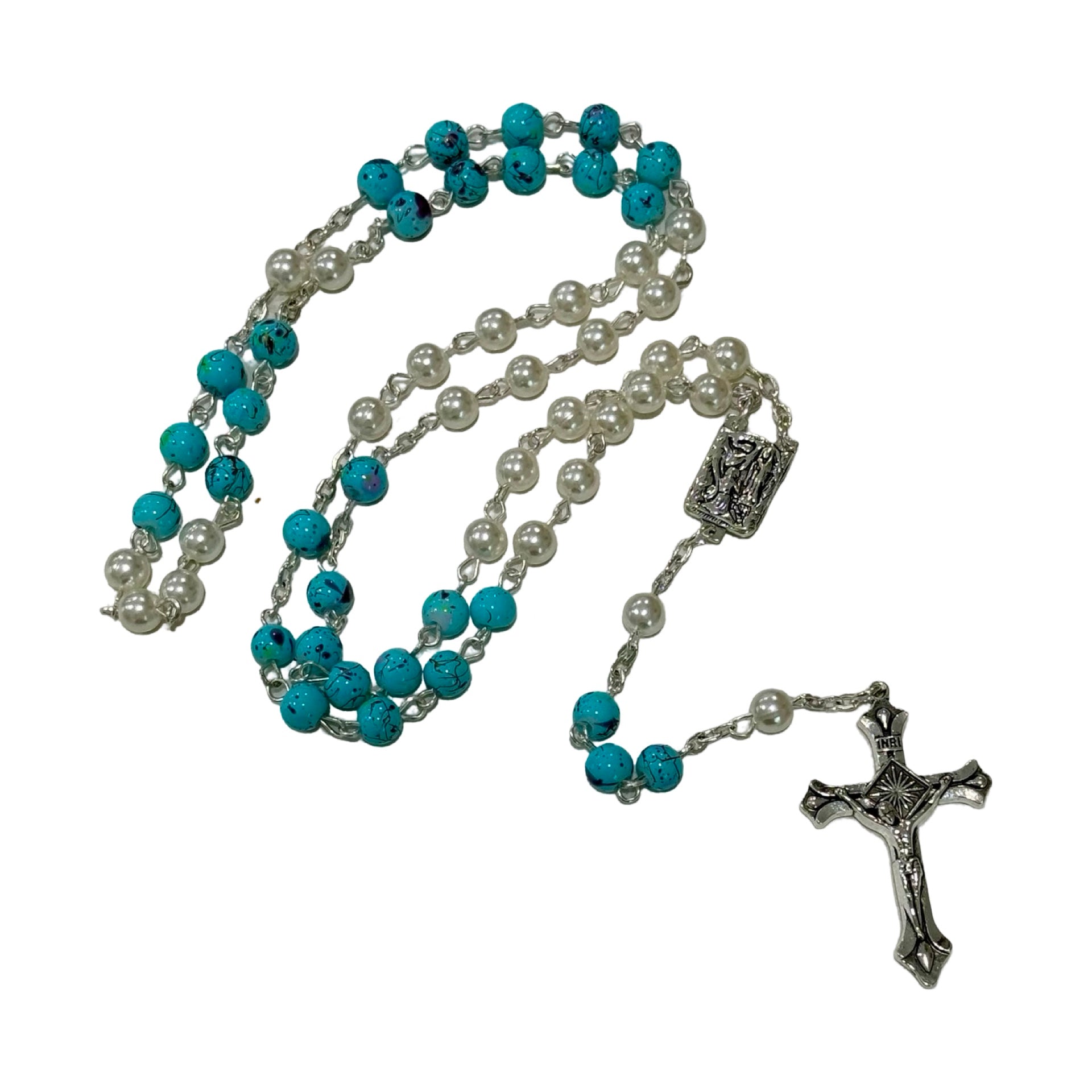 This stunning rosary features marble blue beads with pearl beads, making a beautiful combination. Unique in its design, may its beauty attract many people to pray the holy rosary. It was brought from pilgrimage in Lourdes, France.