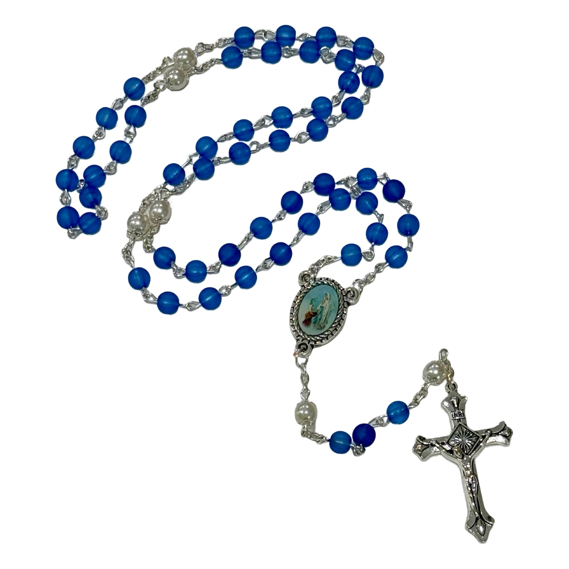 Blue Crystal and Pearl Lourdes Rosary with Colored Medal