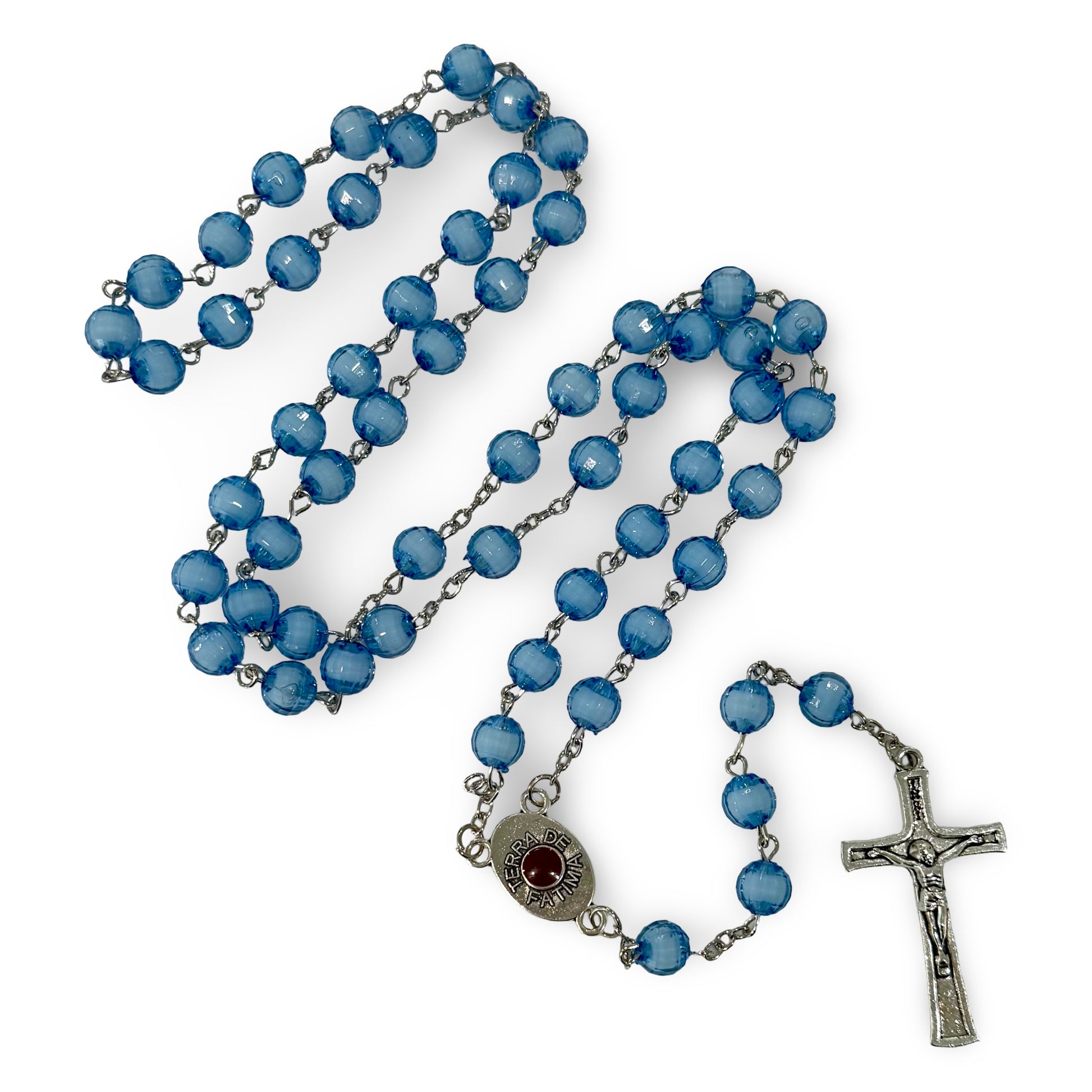 This long blue Fatima rosary has unique beads with a light blue center surrounded by crystal blue outside. The center medal contains soil from Fatima.