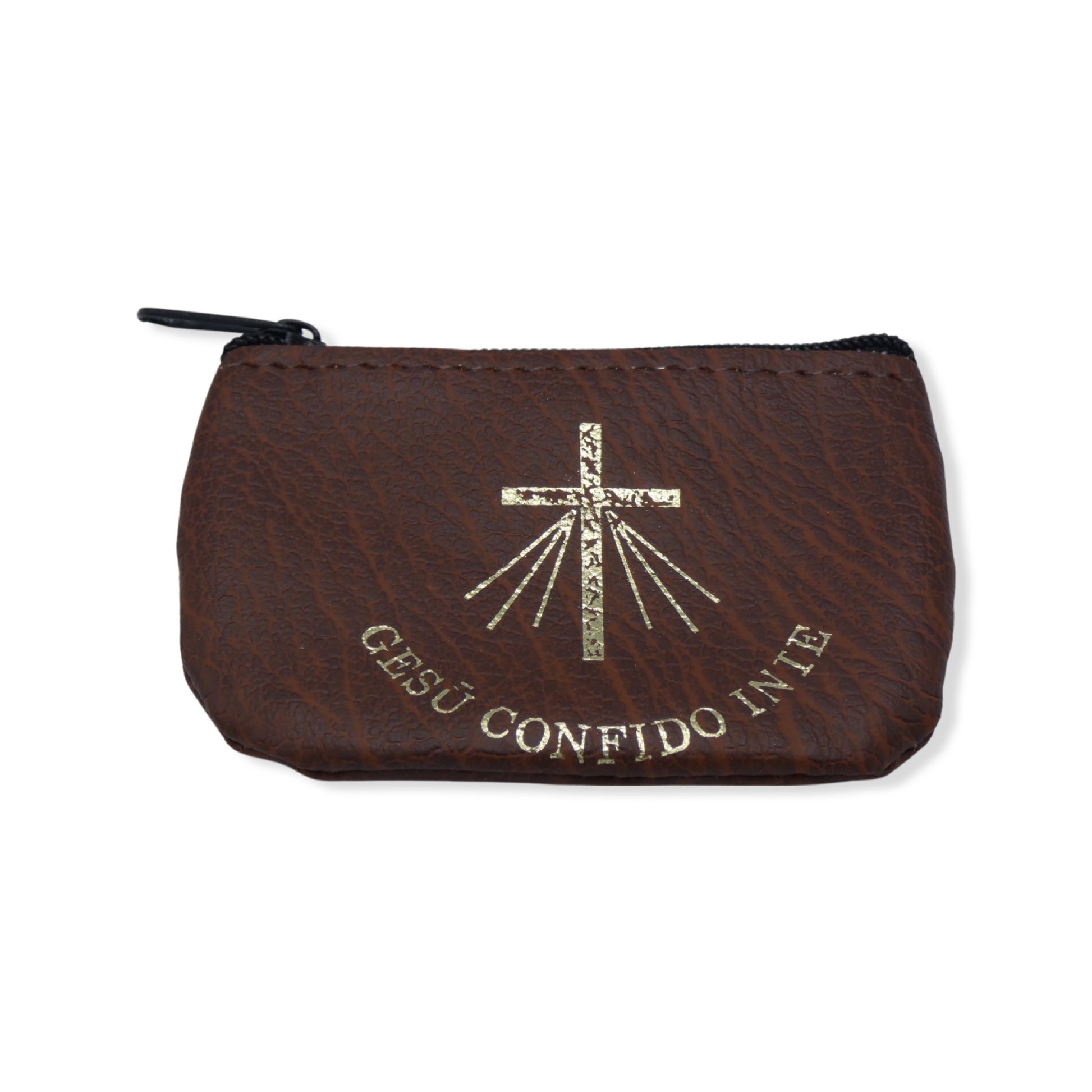 A brown colored pouch, ideal for carrying rosaries, chaplets, and devotional items with you on the go. This pouch fits perfectly in backpacks and purses allowing you to never be without spiritual protection. It bears a golden cross along with the inscription, "Gesù Confido In Te" (Jesus I Trust In You).