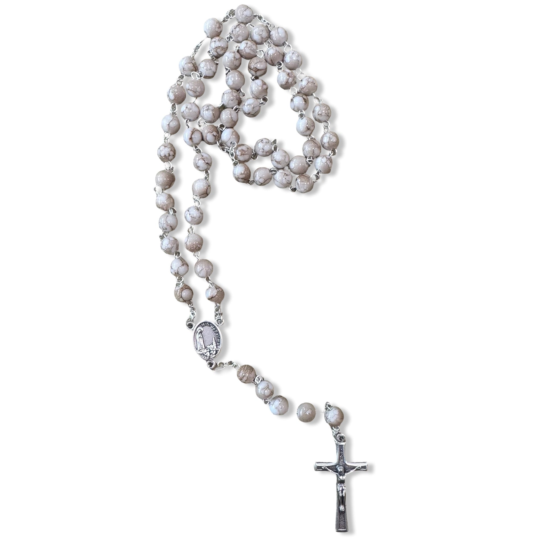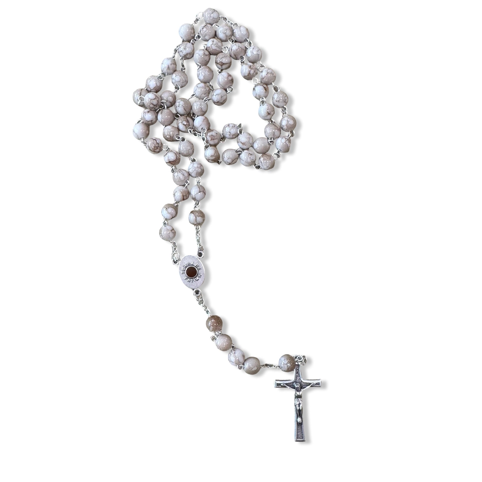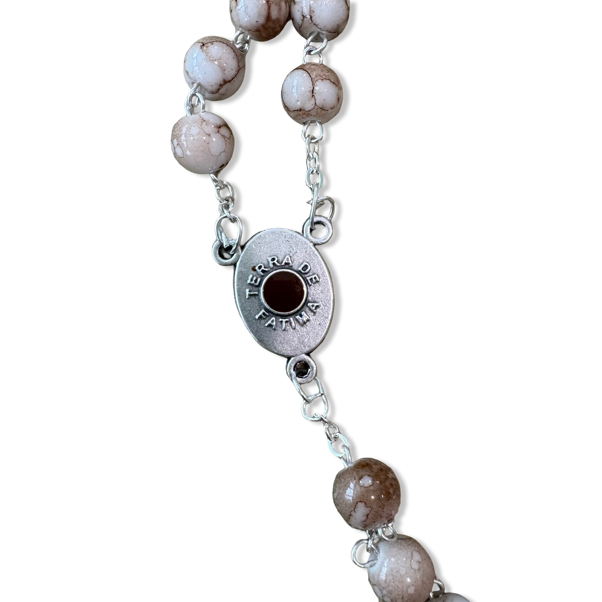 This handcrafted rosary comes from Fatima, Portugal, and features marbled beads. The centerpiece contains a small amount of soil from Fatima, offering a connection to the place of the Marian apparitions.