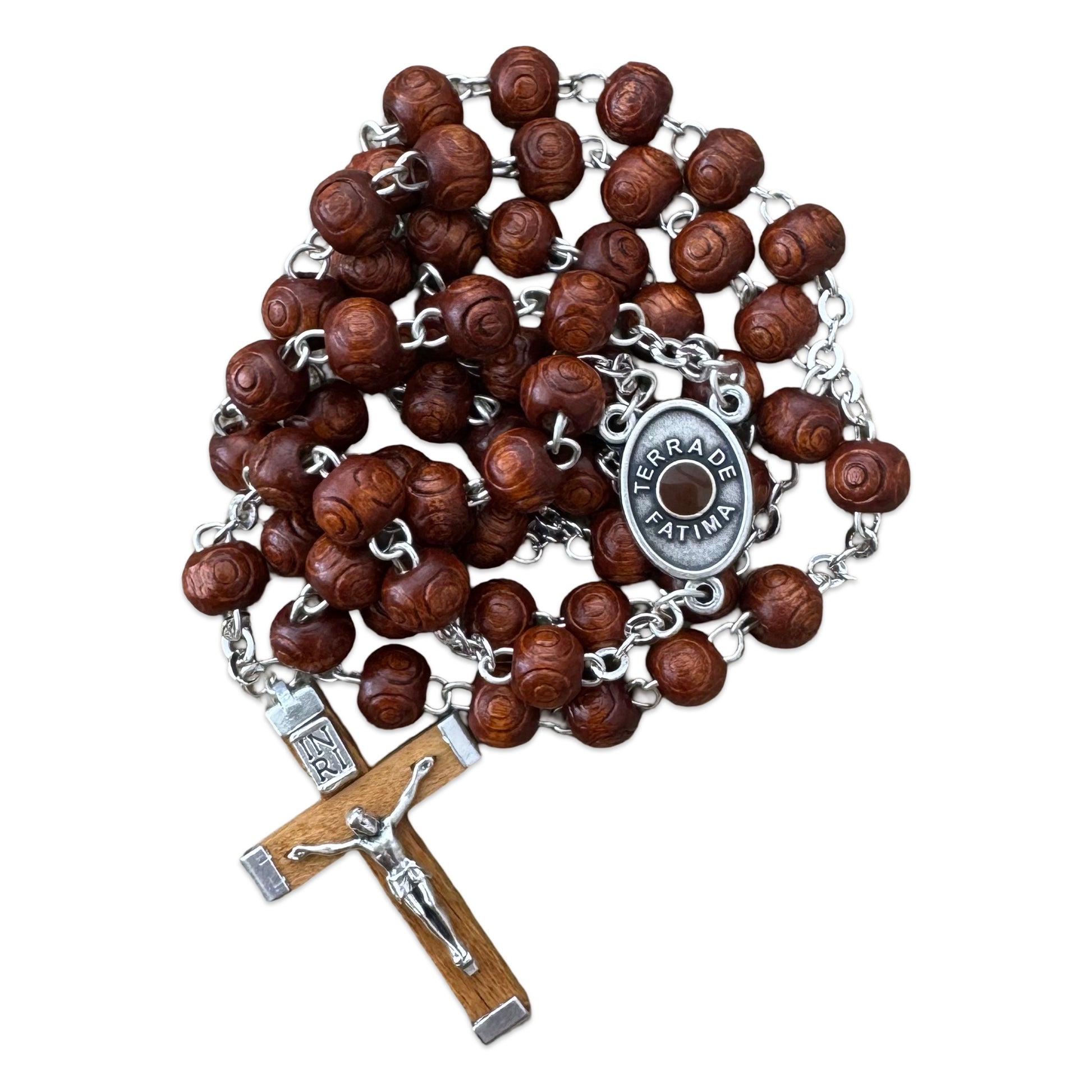 Description: This Marian wooden rosary is special as it includes carved beads that look like rose marks. An additional feature of the rosary is that it contains the soil of Fatima in the center medal. This rosary would make a wonderful gift for those who are unable to physically go to Fatima to visit the site of the Marian apparitions. This rosary comes with the option of an English or Spanish holy card.