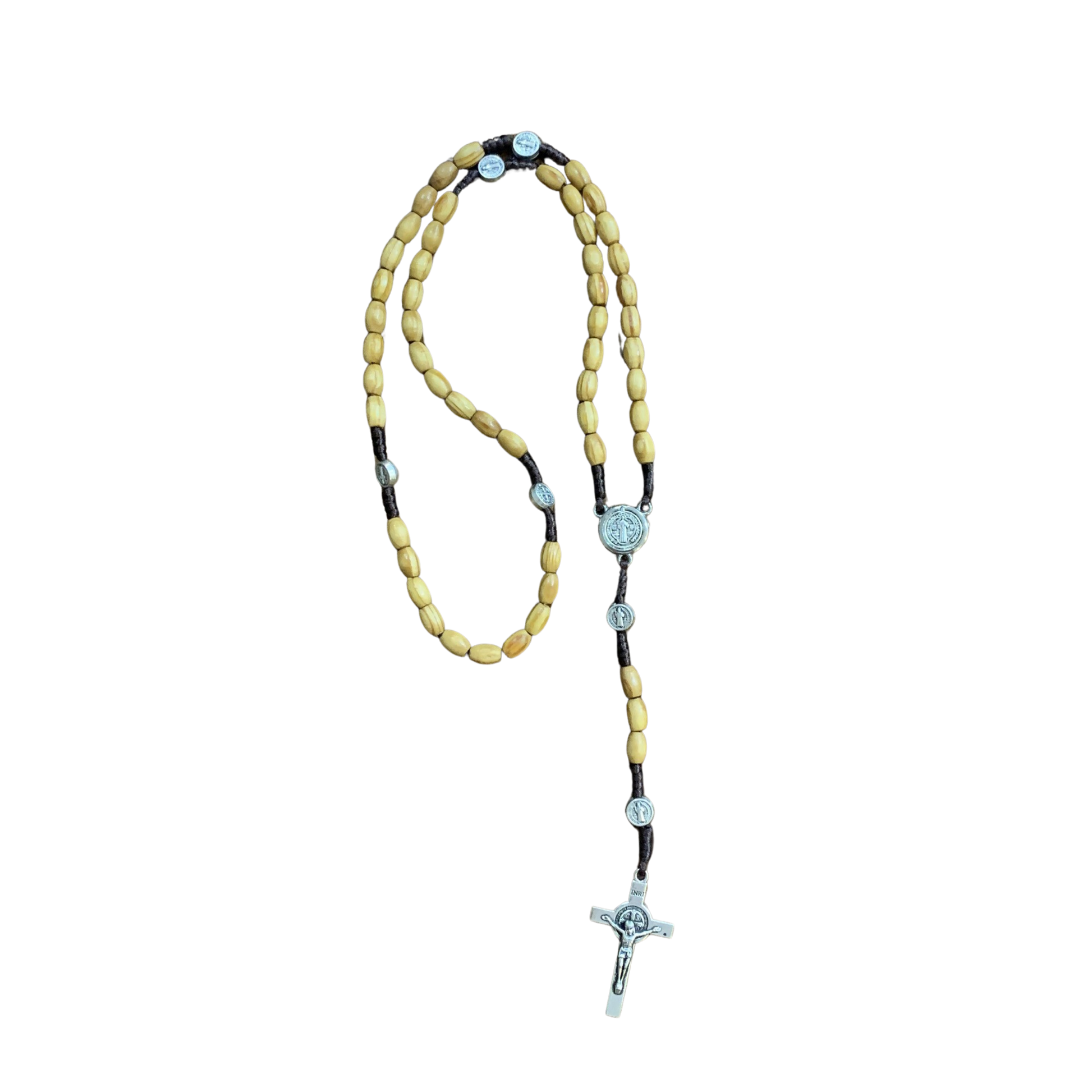 Description: This brown stringed rosary with brown oval beads includes medals of St. Benedict as the Our Father beads and the center medal. The rosary comes packaged with an image of Our Lady Queen of peace. This rosary comes all the way from Medugorje and is brought by Mother Adela, SCTJM - Foundress, when she leads pilgrimages to this Marian site. This rosary, coming from the land where it is believed that Our Lady has been appearing for many years, is a wonderful gift for others or for yourself to pray for family, friends, and the entire world.