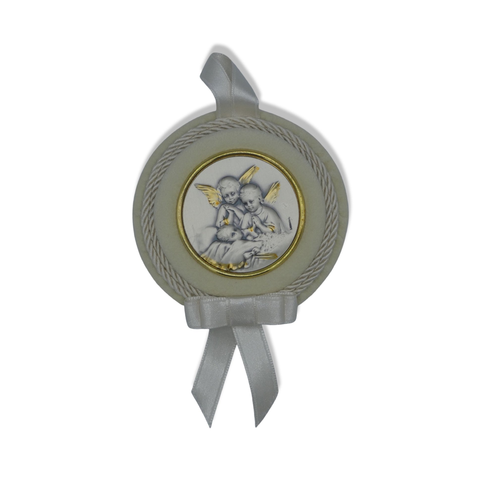 A silver crib medallion of the Guardian Angels is an elegant addition to any nursery, bringing many graces of protection along with it! This product is brought with love by our Sisters serving the Heart of the Church in Rome, Italy!