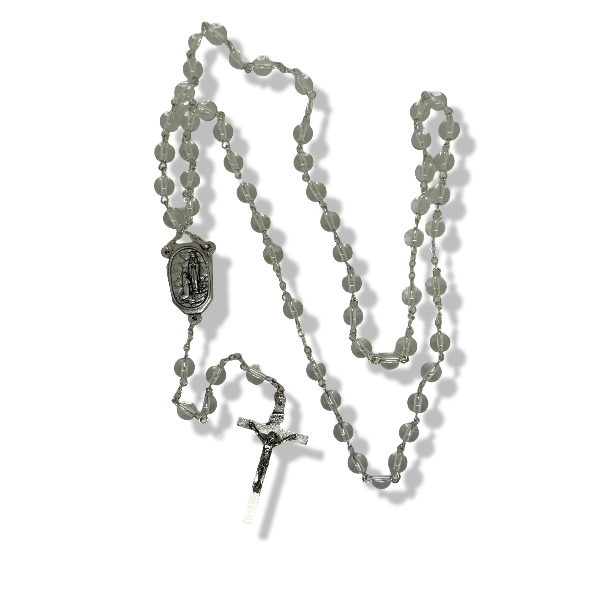 This Lourdes rosary is made of clear beads. The beautiful medal of Our Lady of Lourdes with Lourdes water inside makes this item a special memento of the Sanctuary of Lourdes! A Lourdes rosary is perfect to pray for the sick, poor, and suffering. This product is brought with love by our Sisters on pilgrimages to Lourdes, France.