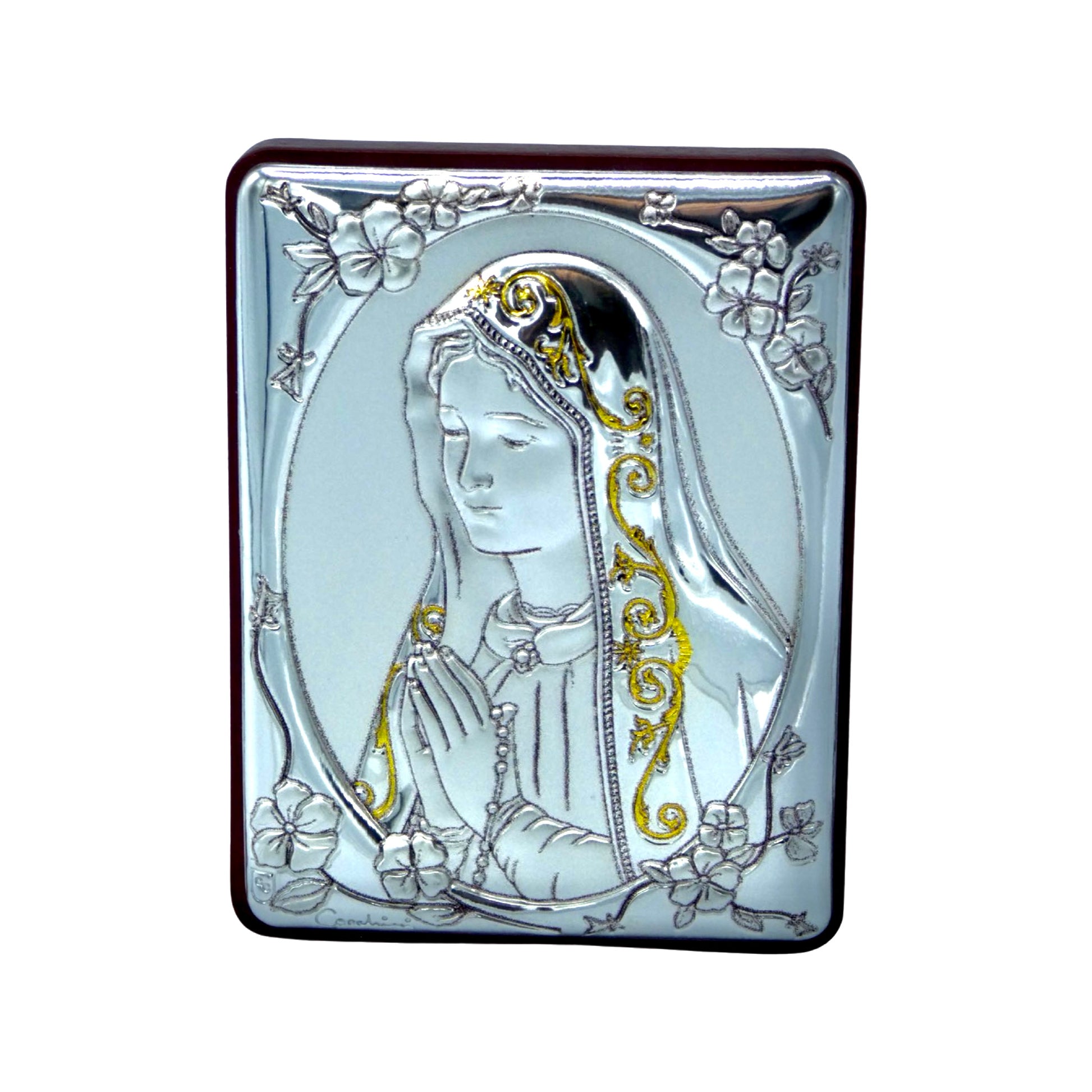 A colored silver image of Our Lady of Fatima is an elegant addition to any home or office, bringing a beautifully Marian presence to any space. This image is accompanied by a removable metal footing to be stood on tables and bookshelves. This product is brought with love by our Sisters serving the Heart of the Church in Rome, Italy!