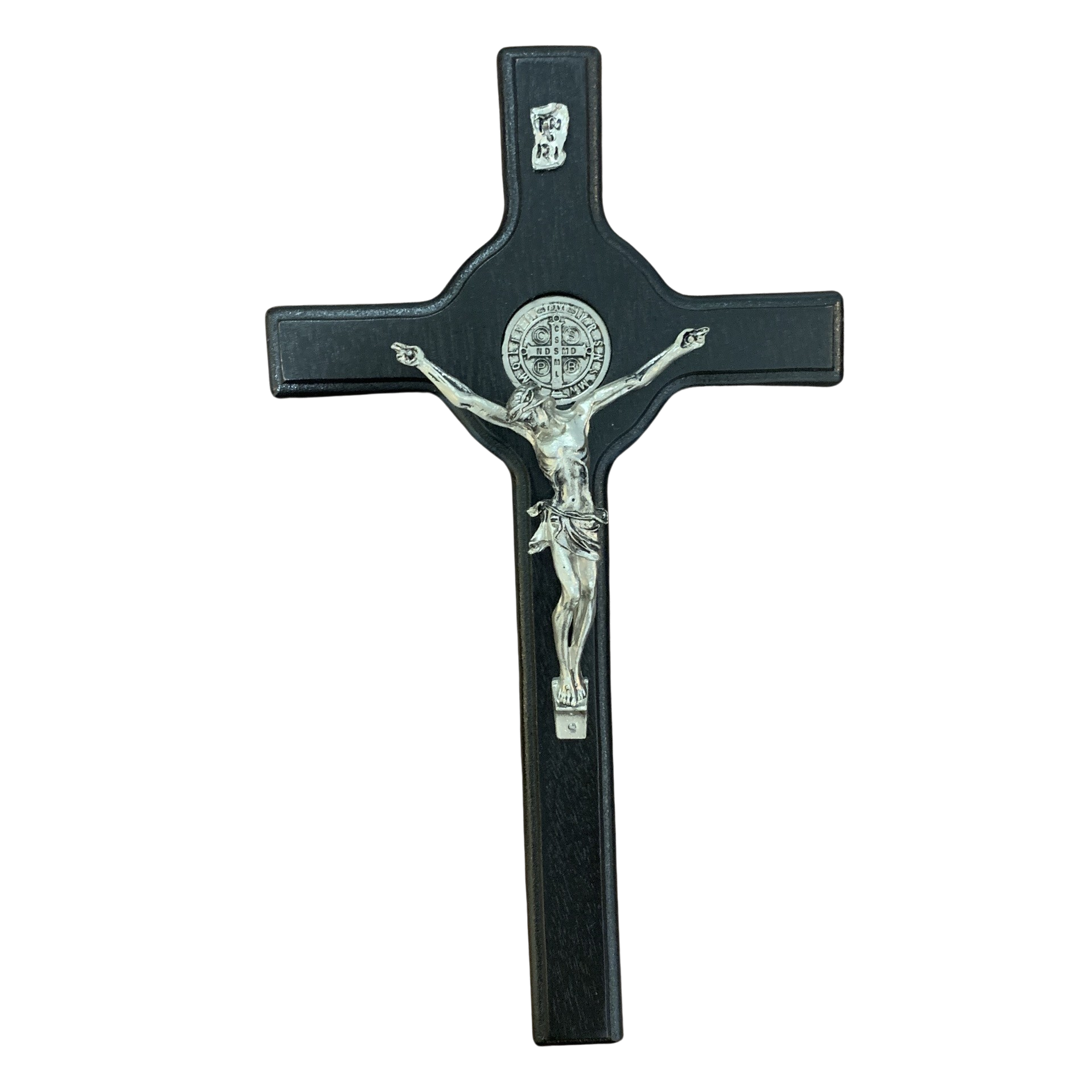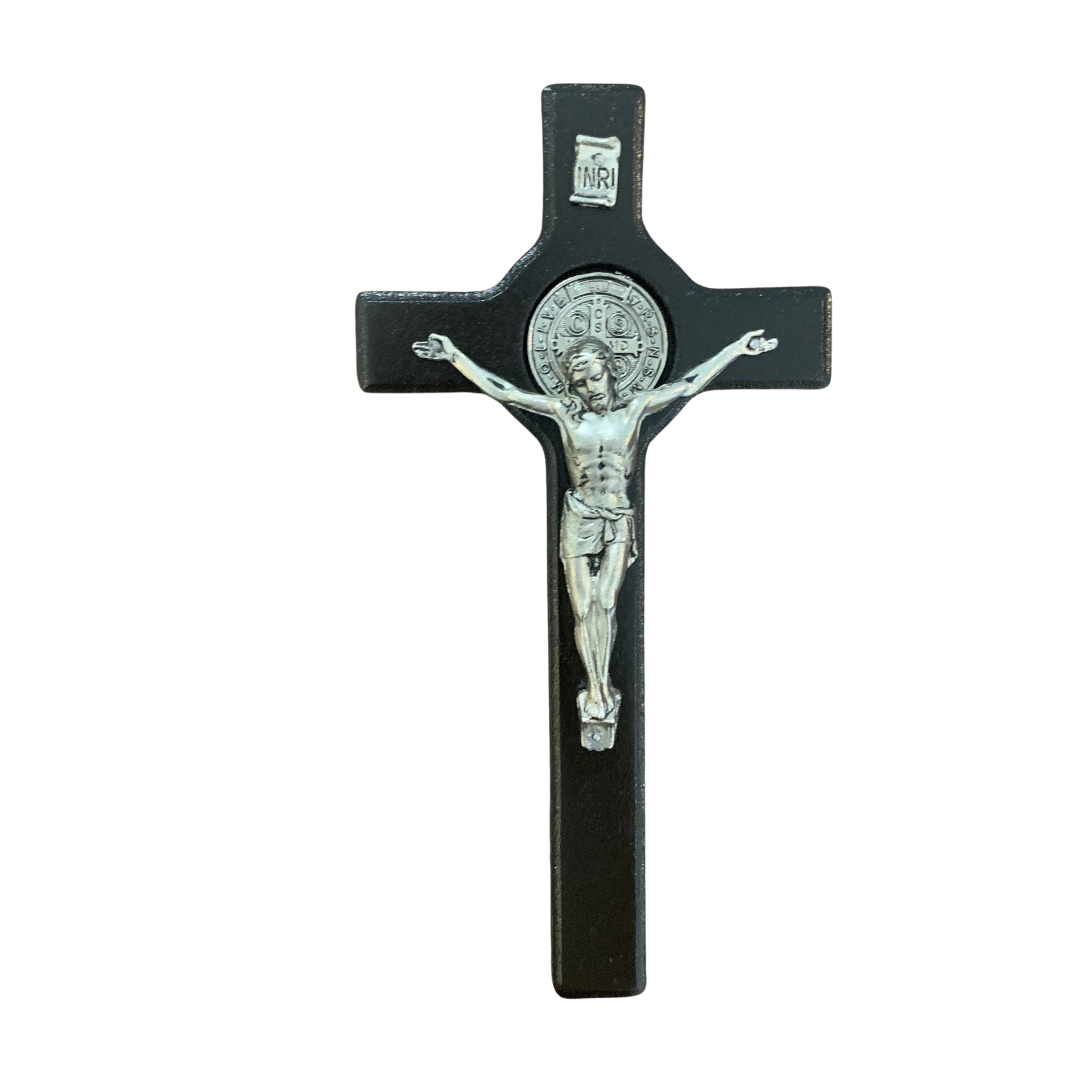 A traditional black oak stained wood cross upon which hangs a dark silver corpus. A medium silver St. Benedict medal is set where the crossbeams meet. A powerful sacramental of the Church, the St. Benedict crucifix, when exorcized and blessed, brings a particular protection of the home where it is placed against evil as well as a particular presence of Christ himself. Available in three sizes, this crucifix is a great addition to small rooms or offices, or to be hung over a bed. These crucifixes come from the Villa of Our Lady of Guadalupe in Mexico and brought to our shop with love by members of the Family of the Pierced Hearts.