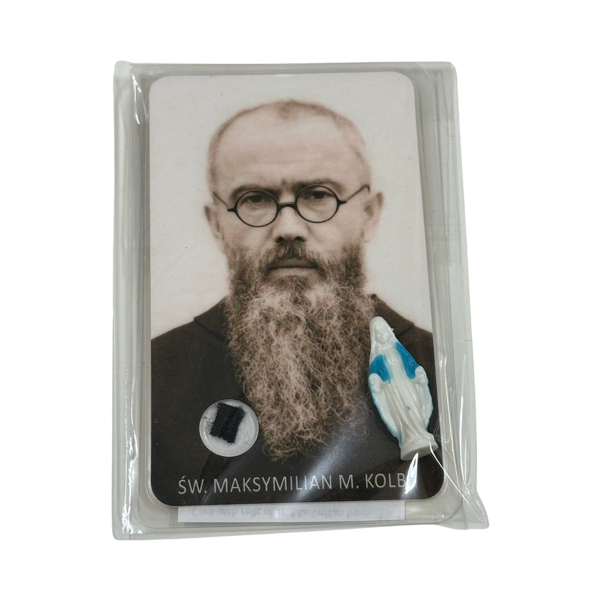 This charming miniature statue of Our Lady comes all the way from the City of the Immaculate in Poland, included is a holy card with a third class relic of St. Maximilian Kolbe. All of this was touched to the bed of St. Maximilian Kolbe in Niepokalanow, Poland.