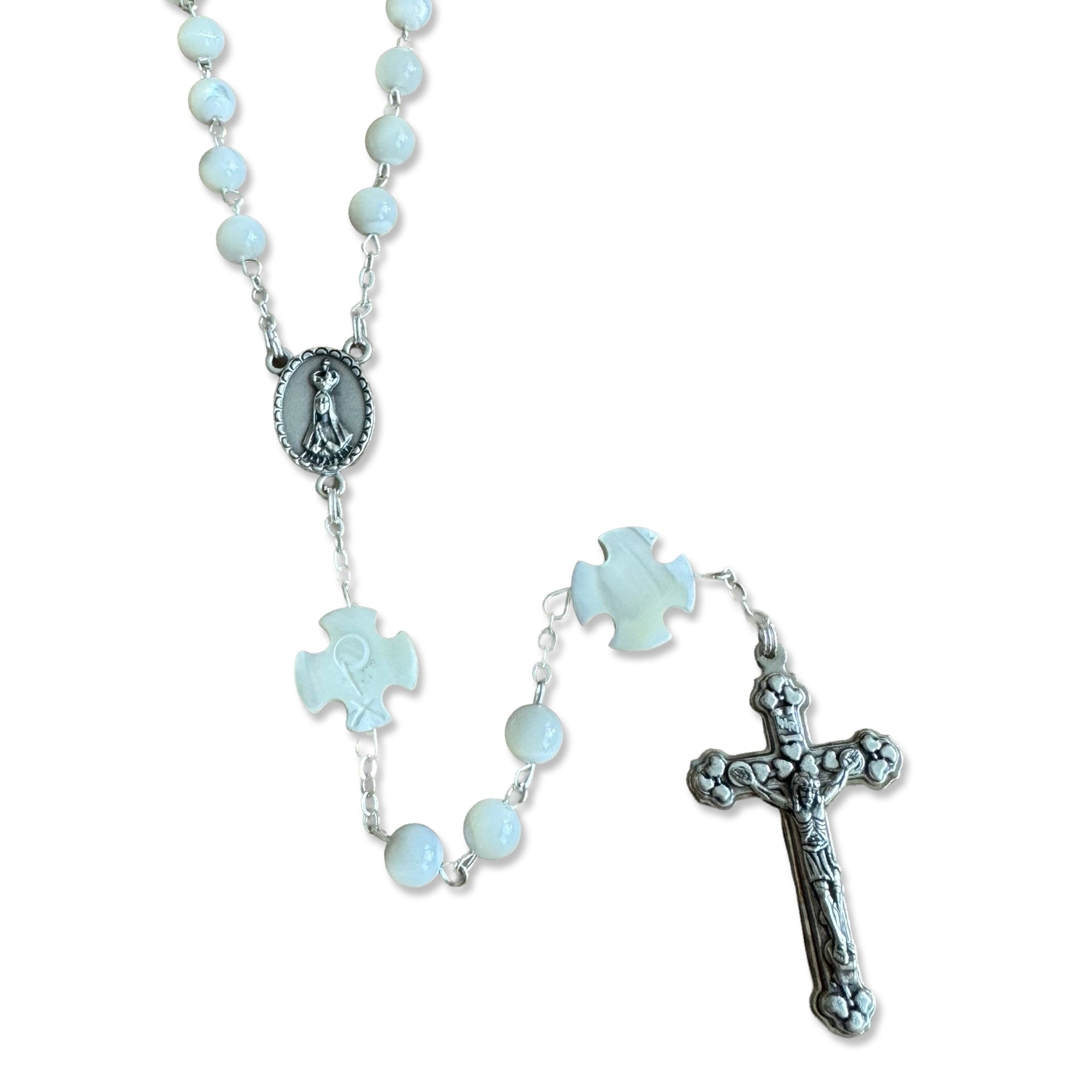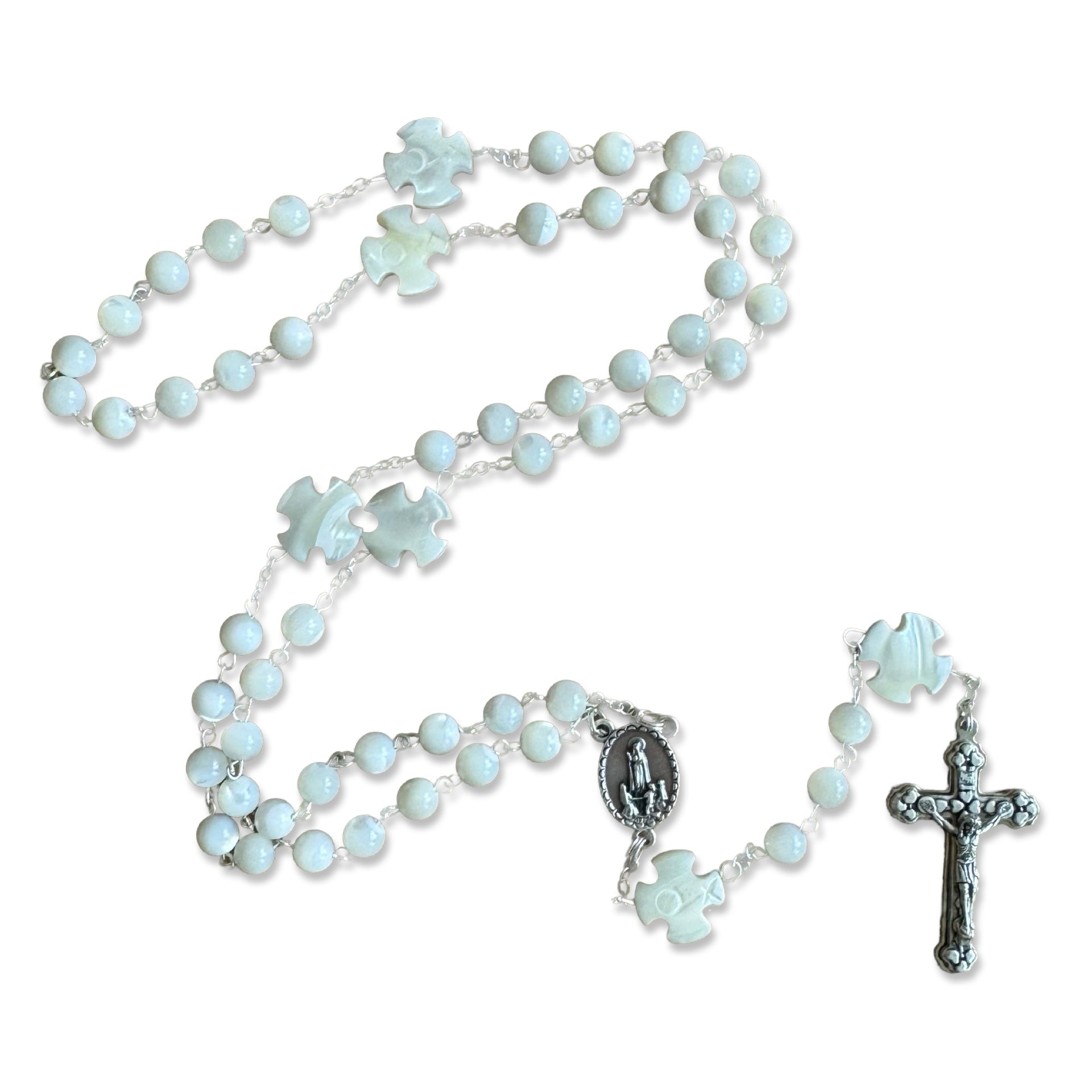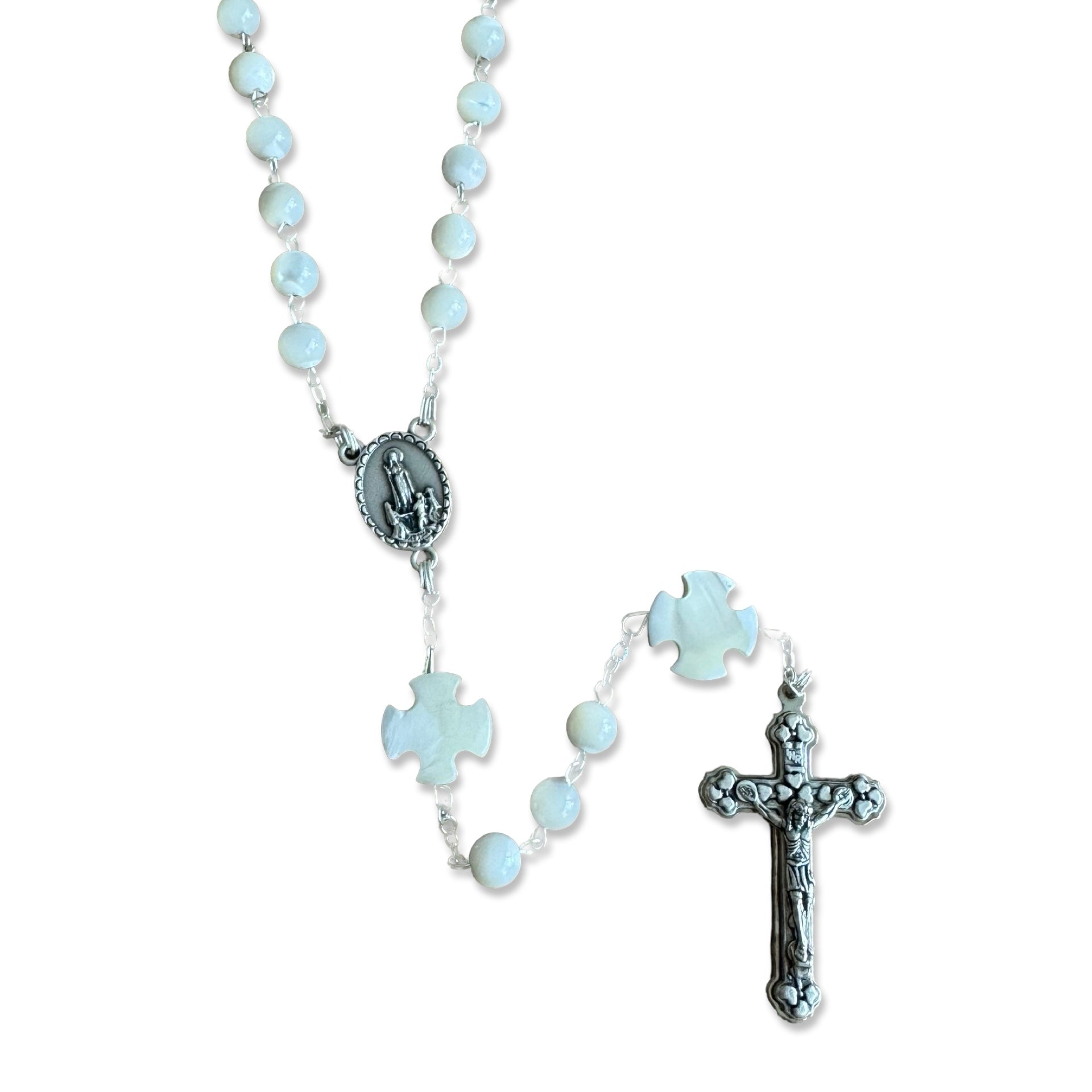 Cross Shaped Mother of Pearl Fatima Rosary with Heart Embellished Crucifix