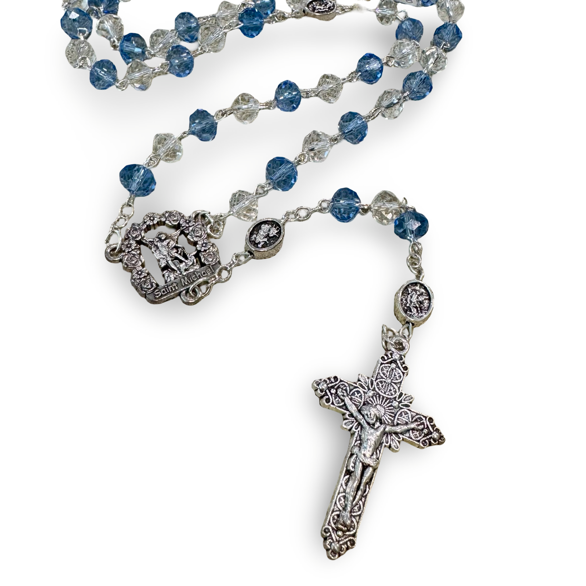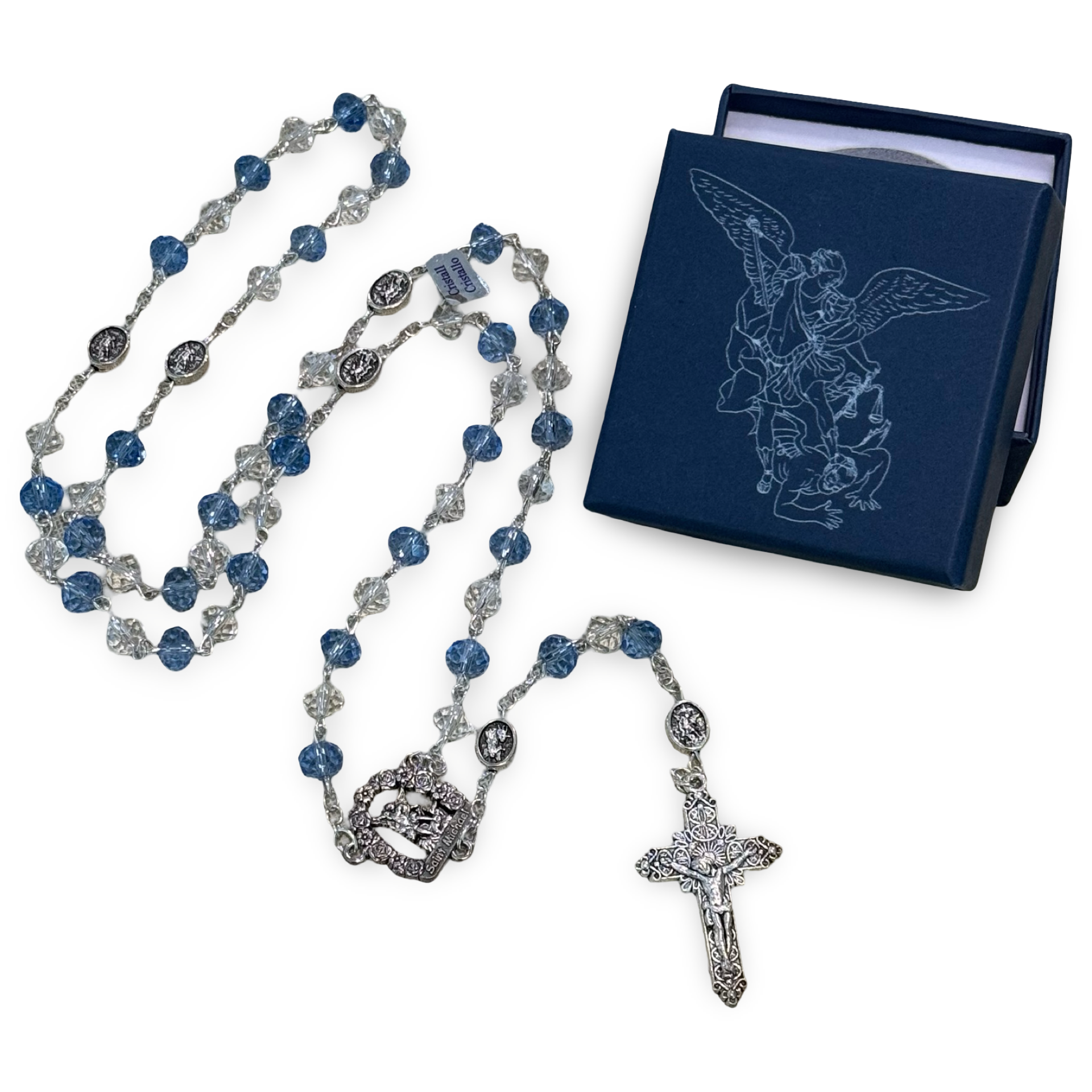 Crystal and Blue St. Michael Rosary in Case