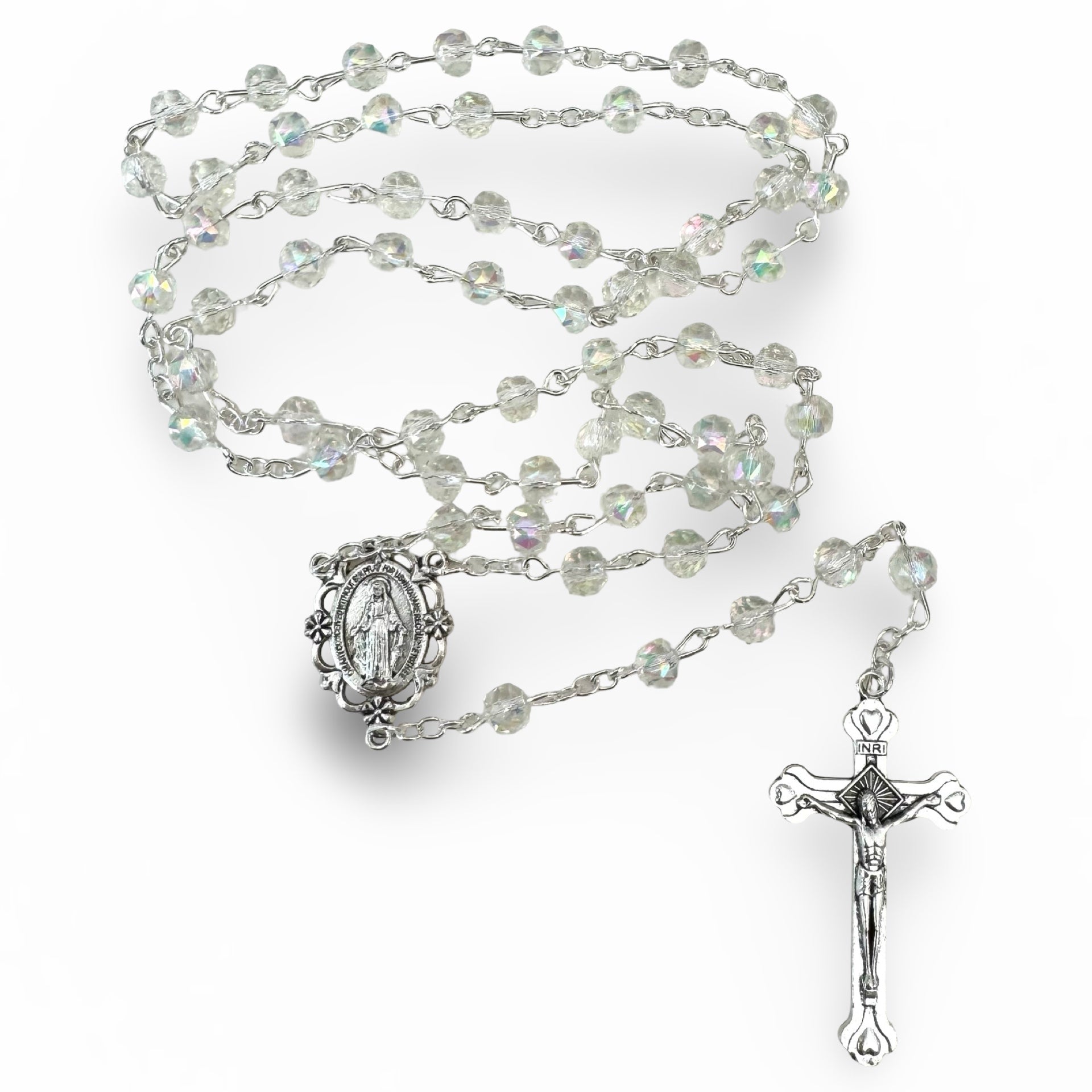 This crystal rosary comes in two colors and has a beautifully embellished miraculous medal center piece, and a crucifix medal from Jerusalem.