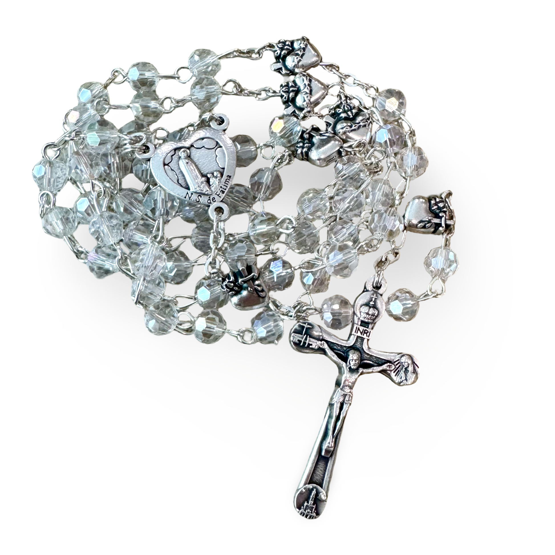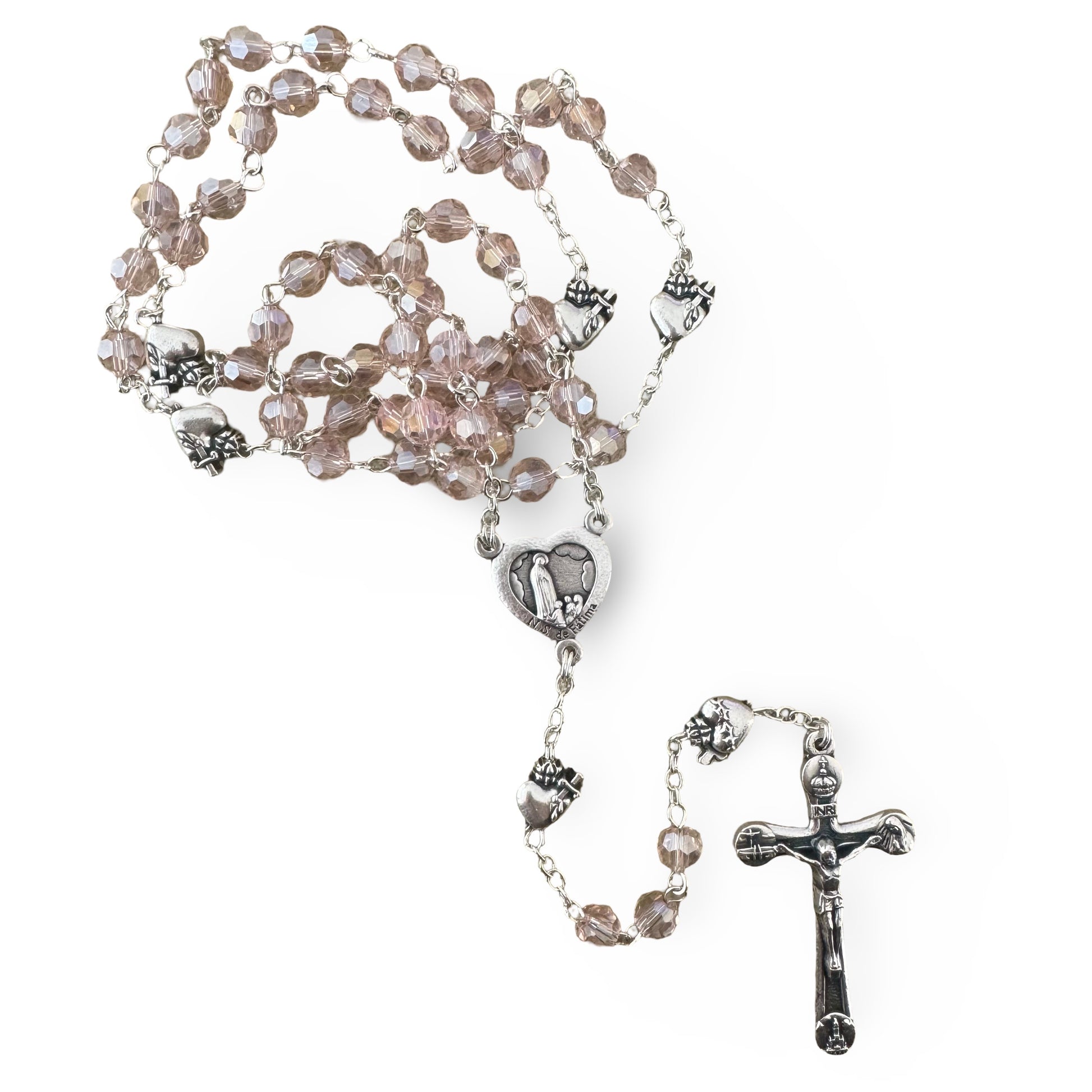 This beautiful crystal rosary features Our Father beads in the shape of the Pierced Hearts of Jesus and Mary. It comes together at the center with a heart shaped bead bearing Our Lady's Image. It comes in clear crystal or pink crystal beads. Let us respond to the call of Our Lady of Fatima by praying daily the Holy Rosary!