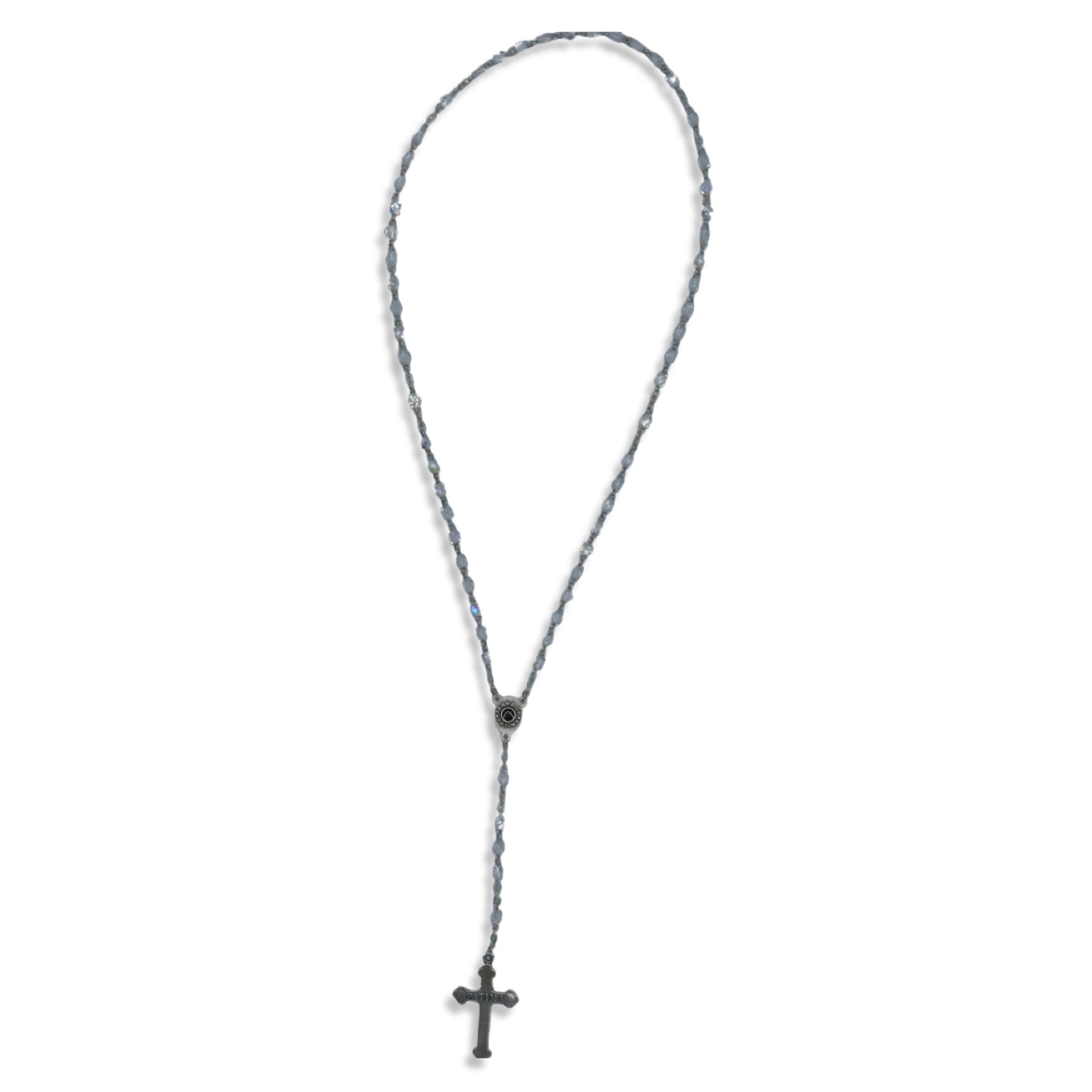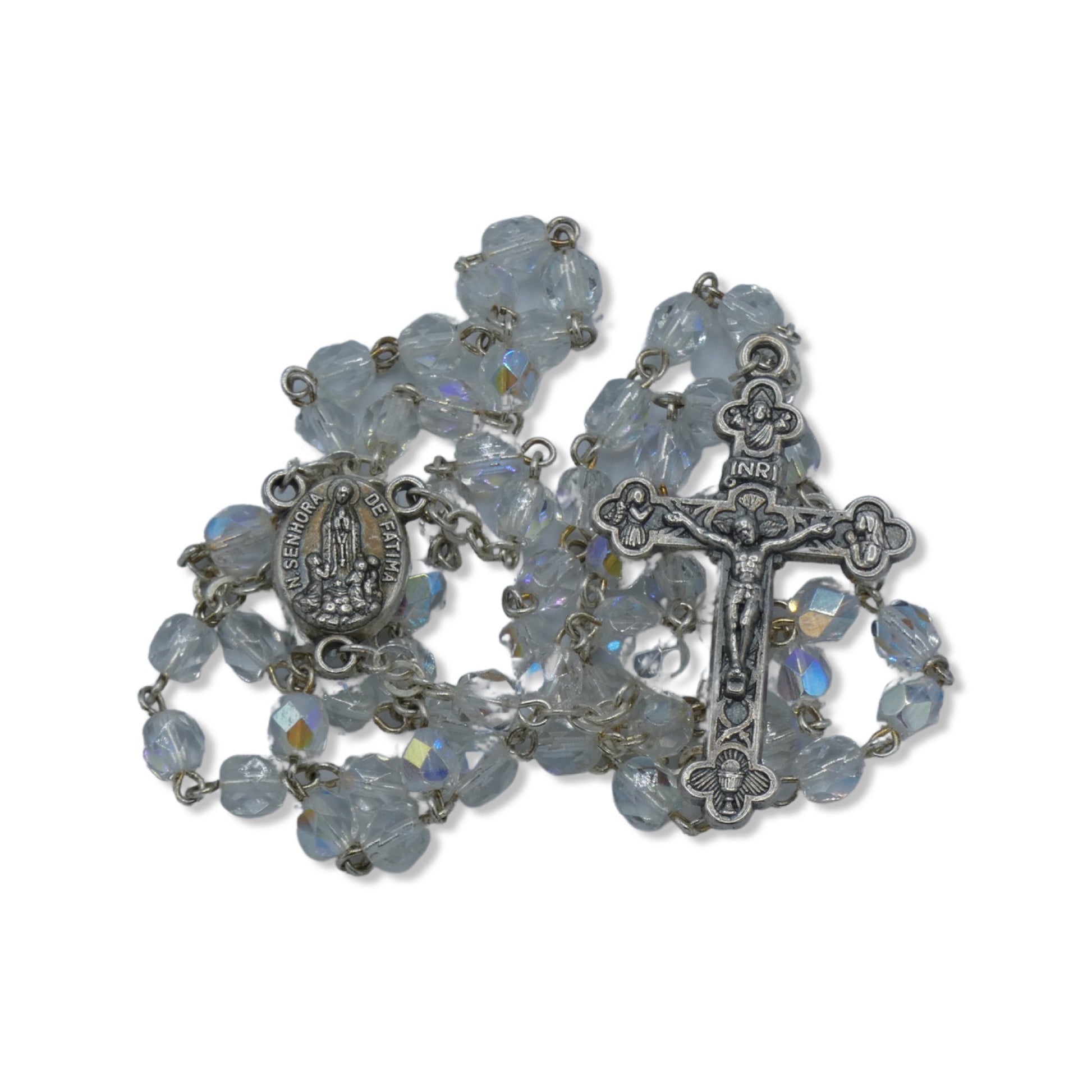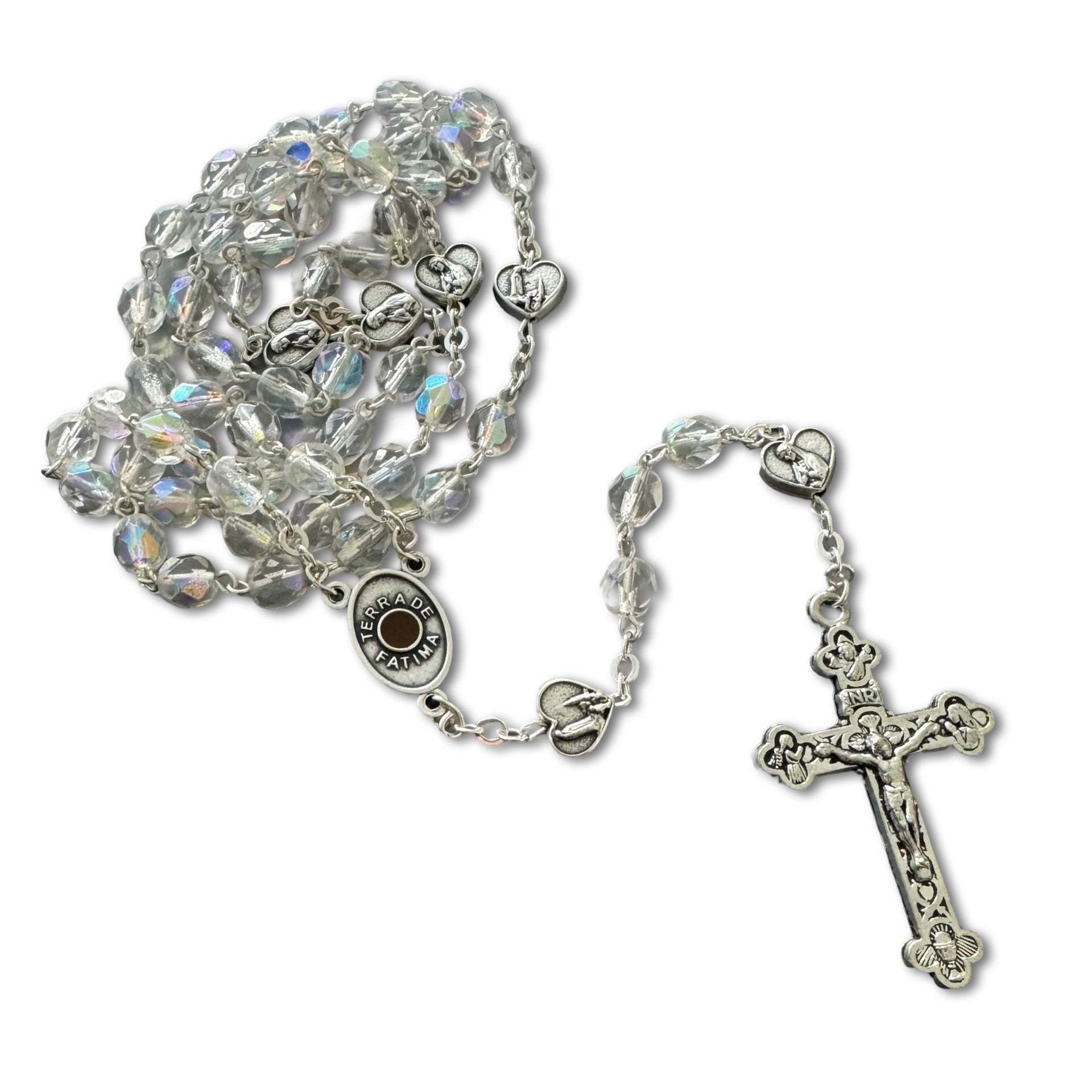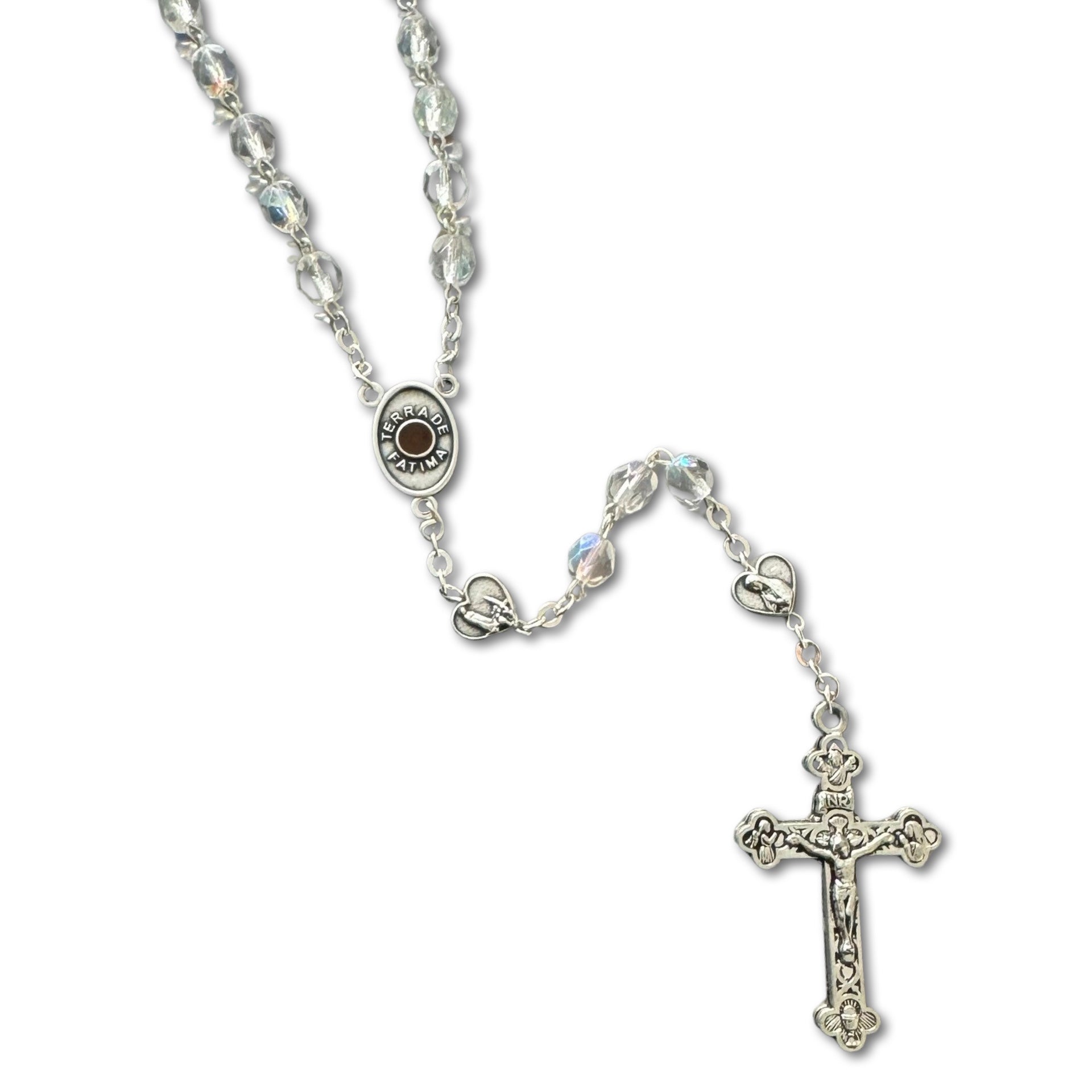 This crystal rosary features soil from Fatima and comes with the option of either silver heart beads with an image of Our Lady of Fatima or a classic crystal bead for the Our Father beads.