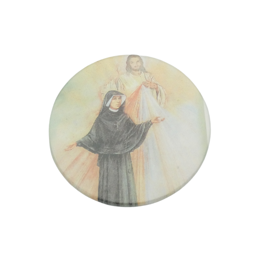 A beautiful pin button of Divine Mercy and St. Faustina. This item places perfectly on backpacks, jackets, and tote bags to evangelize as you go about everyday travels!