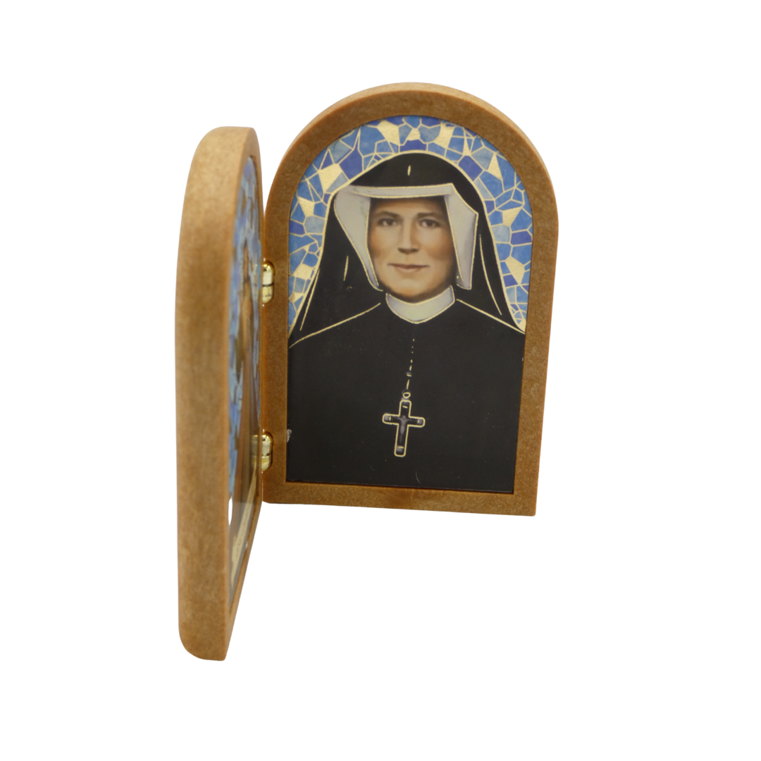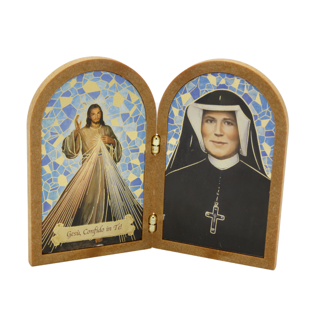 Divine Mercy and St. Faustina make the perfect pair! This folding plaque can be placed on desks and bookshelves as a constant reminder of God's Mercy and a source of spiritual assurance to all those who pass by. The stained glass and golden accented design adds interest to this simple piece which is brought with love by our Sisters serving in Rome, Italy!