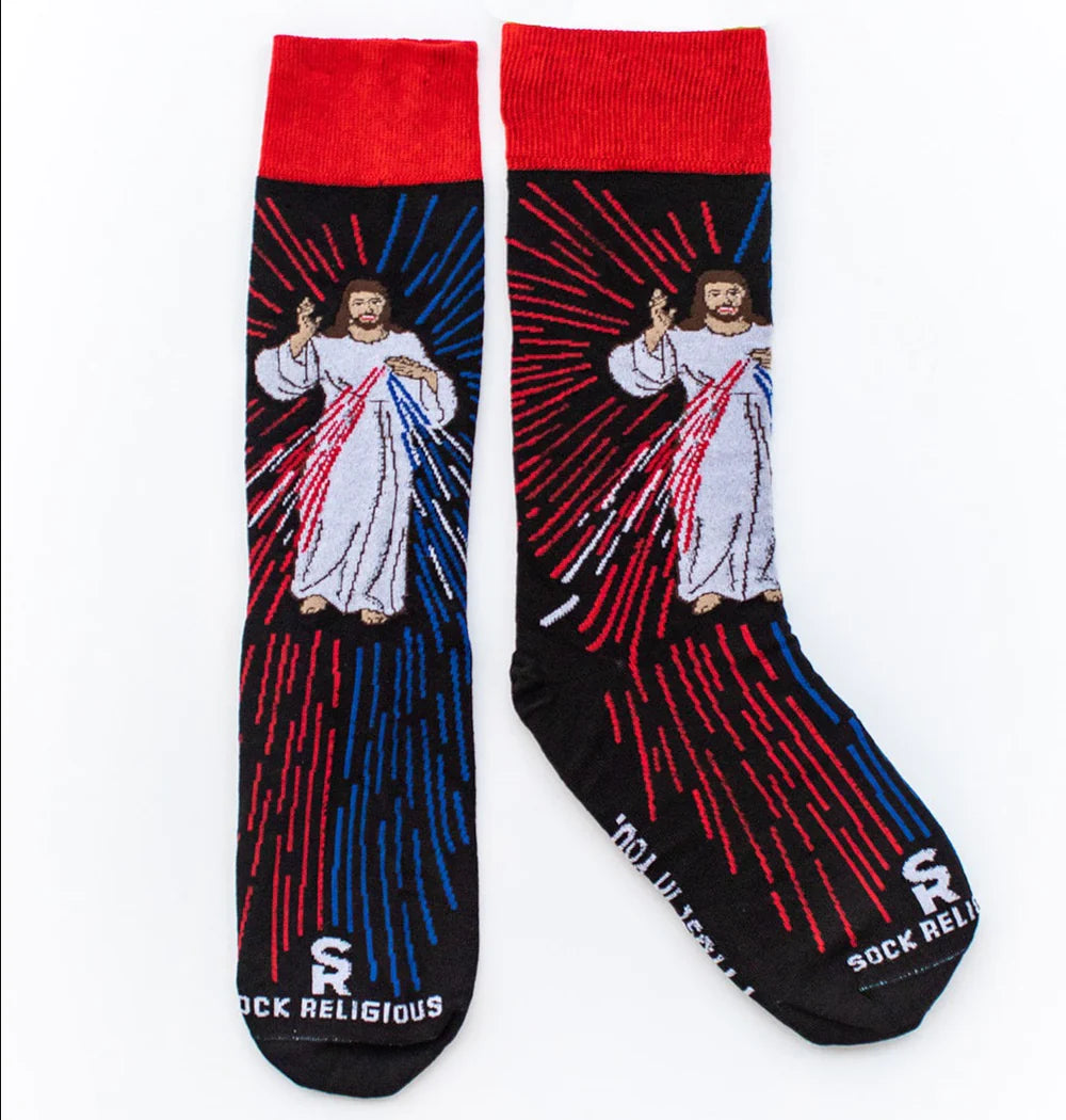 Description: Introducing our Divine Mercy Socks: perfect for any Catholic seeking a stylish and comfortable way to evangelize.