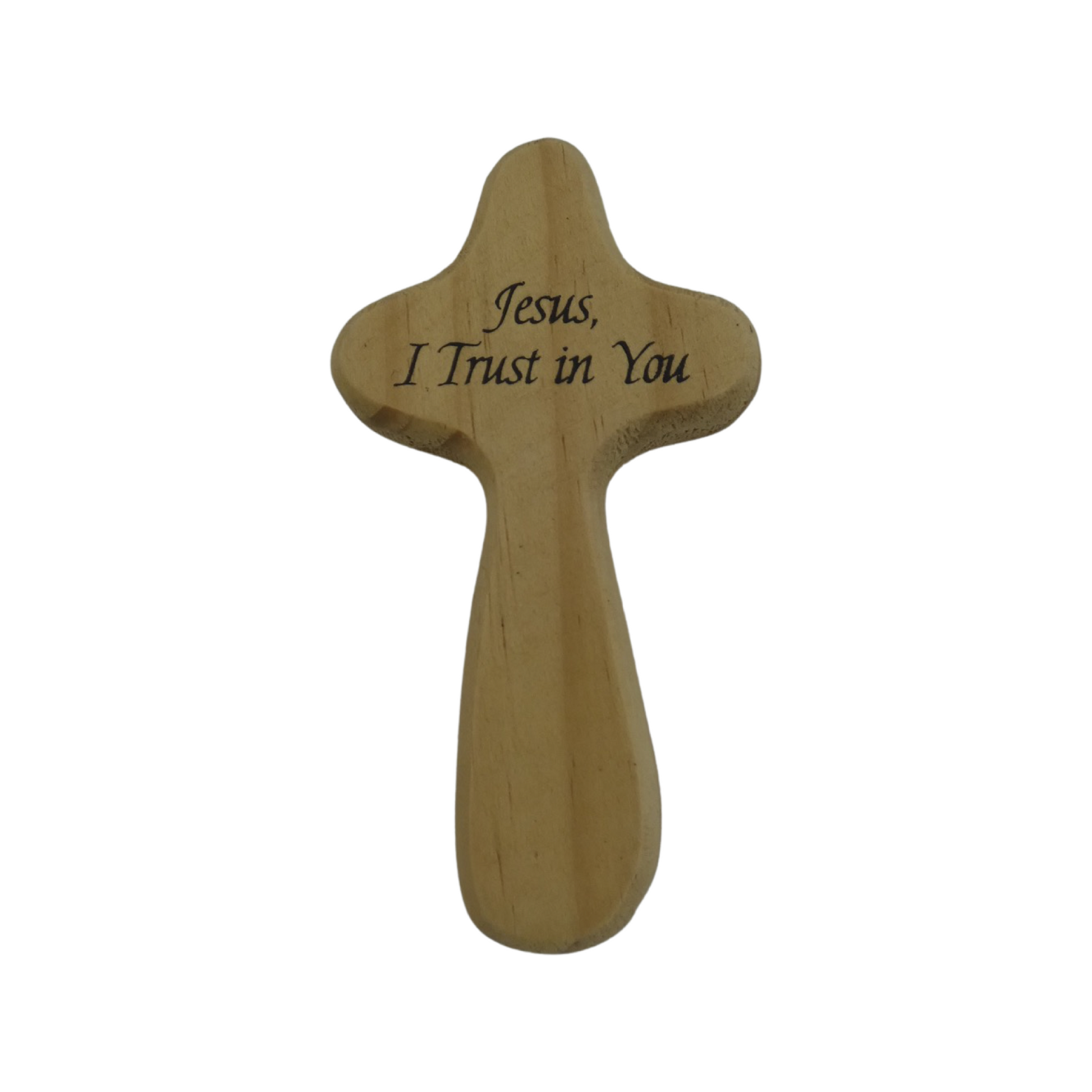 A Divine Mercy Prayer Cross is an excellent prayer aid and comfort for everyday worries. The wooden cross is perfectly fitted to be grasped in the hand. "Jesus I Trust In You" is artistically engraved on the intersection of the cross. This product includes a Divine Mercy prayer card in English.