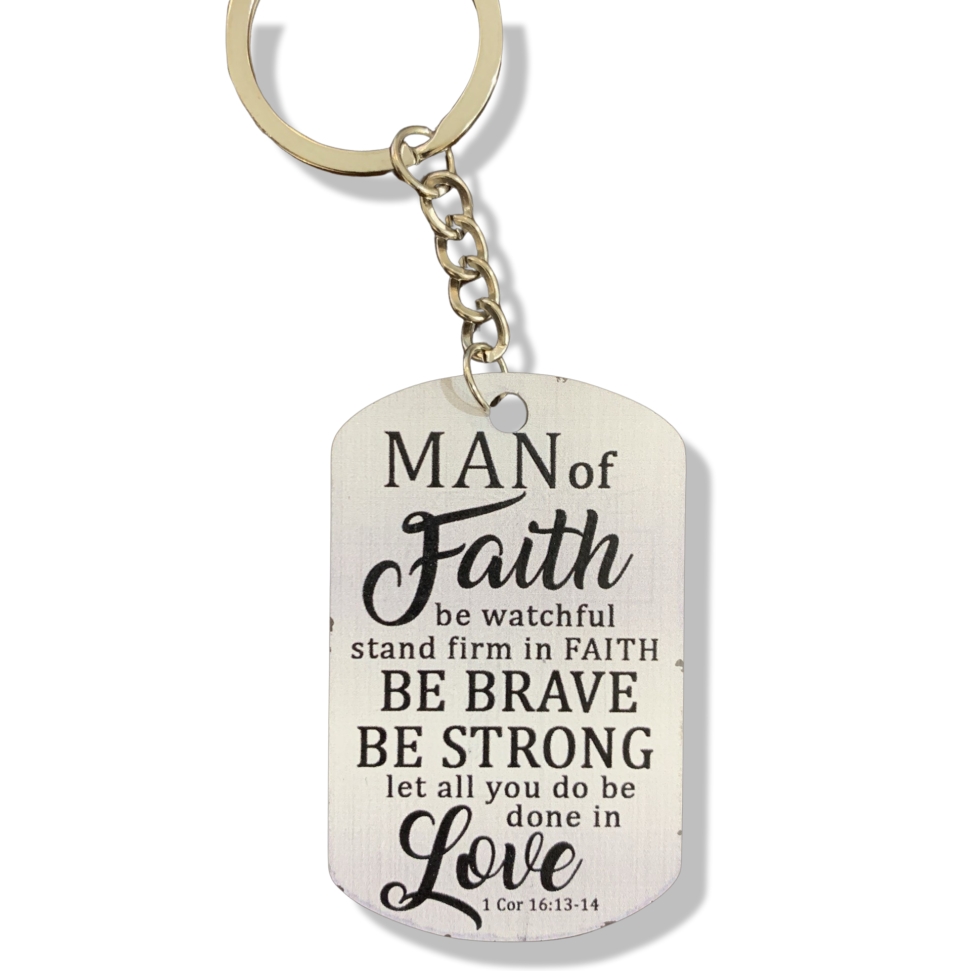 This is a Double Sided Man of Faith Keychain. Featuring a powerful verse from 1 Corinthians and the face of Jesus, this keychain serves as a constant reminder of strength and love. Made for men, it is a meaningful and stylish accessory.