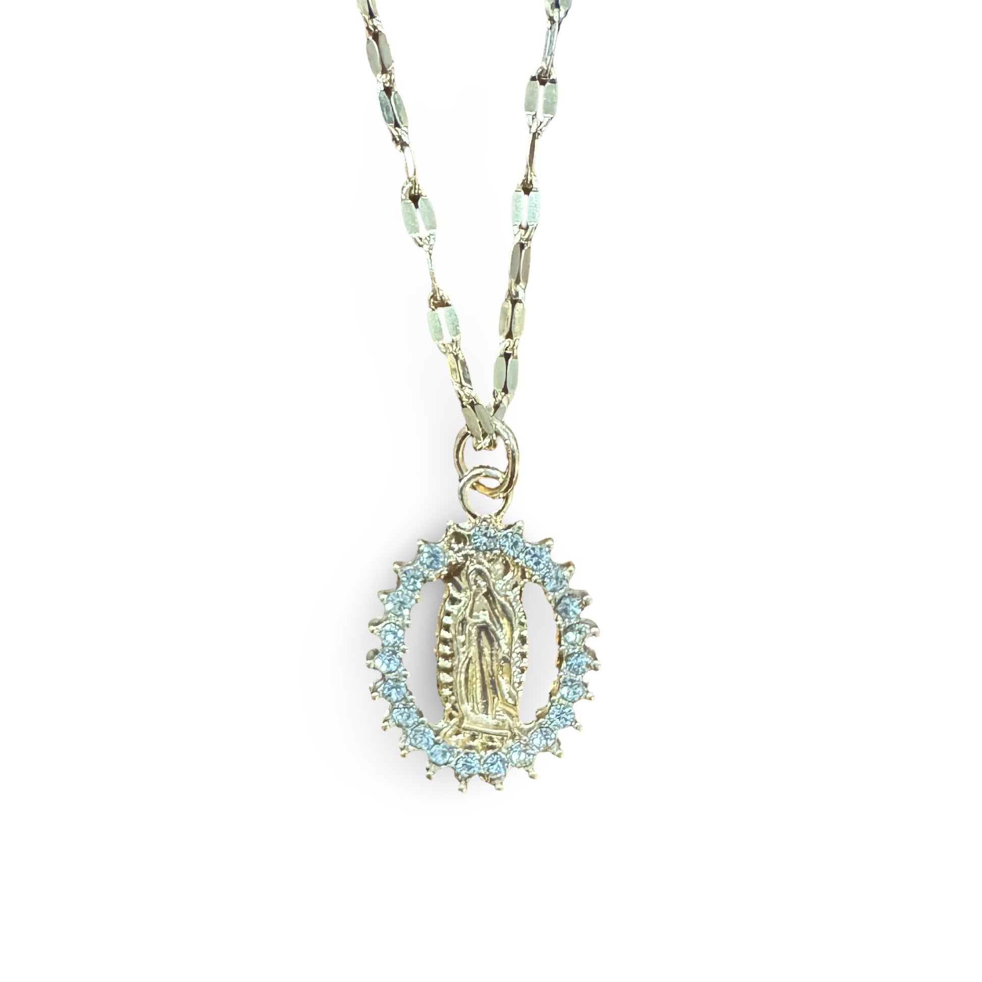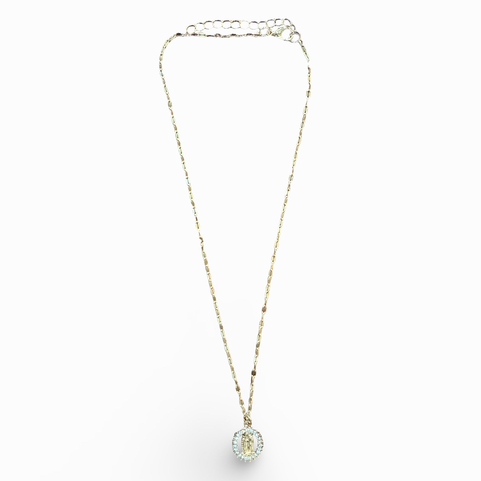 This stunning necklace, featuring a medal of our Lady of Guadalupe surrounded by rhinestones, would make a wonderful addition to any outfit. The necklace is simple, however elegant. It would also make a great gift to any family member or friend.