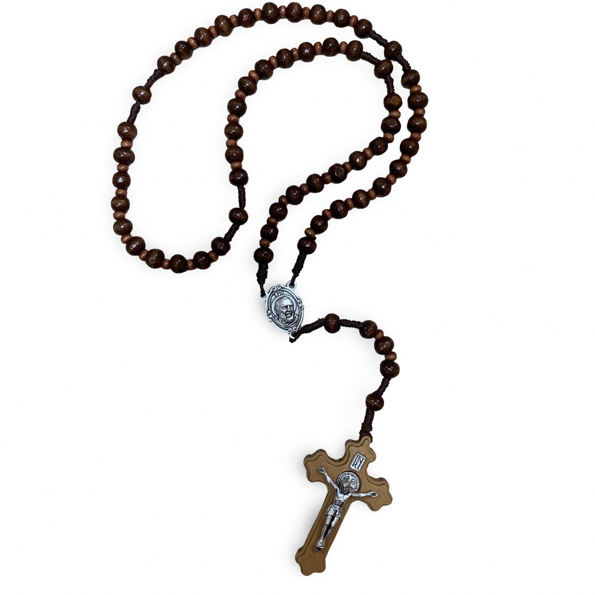 These wood and string rosaries contain a medal with a relic of Padre Pio. The medal has his portrait on one side, and the relic on the other. It also has a large wooden St. Benedict crucifix.