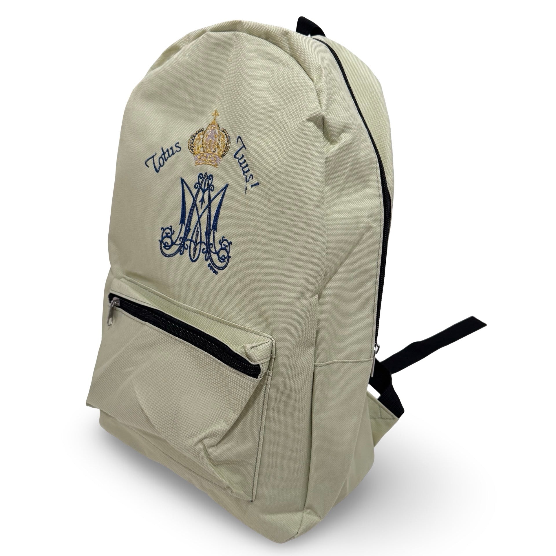 This light sage backpack is beautifully embroidered with the Marian "M" and the words "Totus Tuus" to encourage us to entrust ourselves to Mary so She can bring us to Her Son, Jesus.