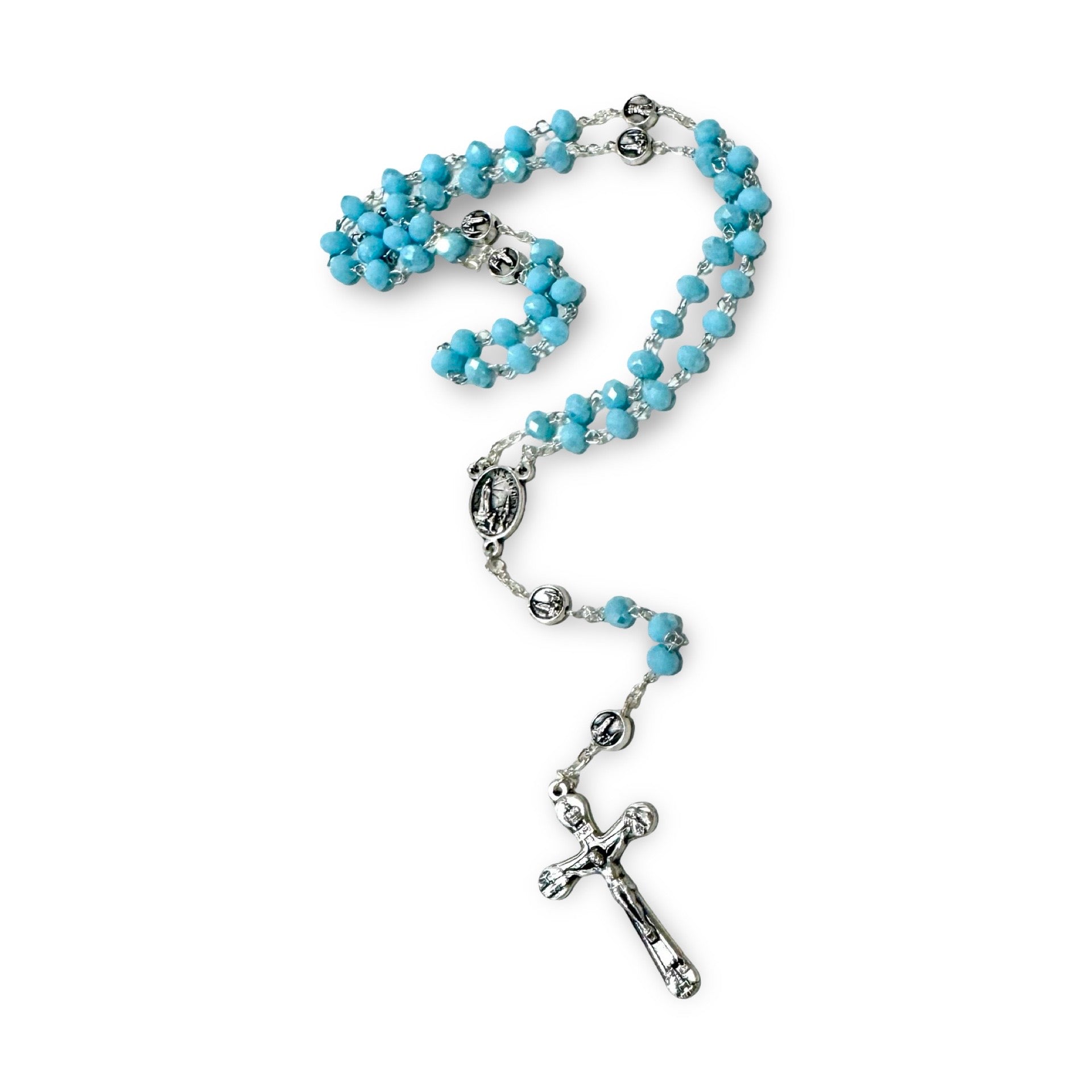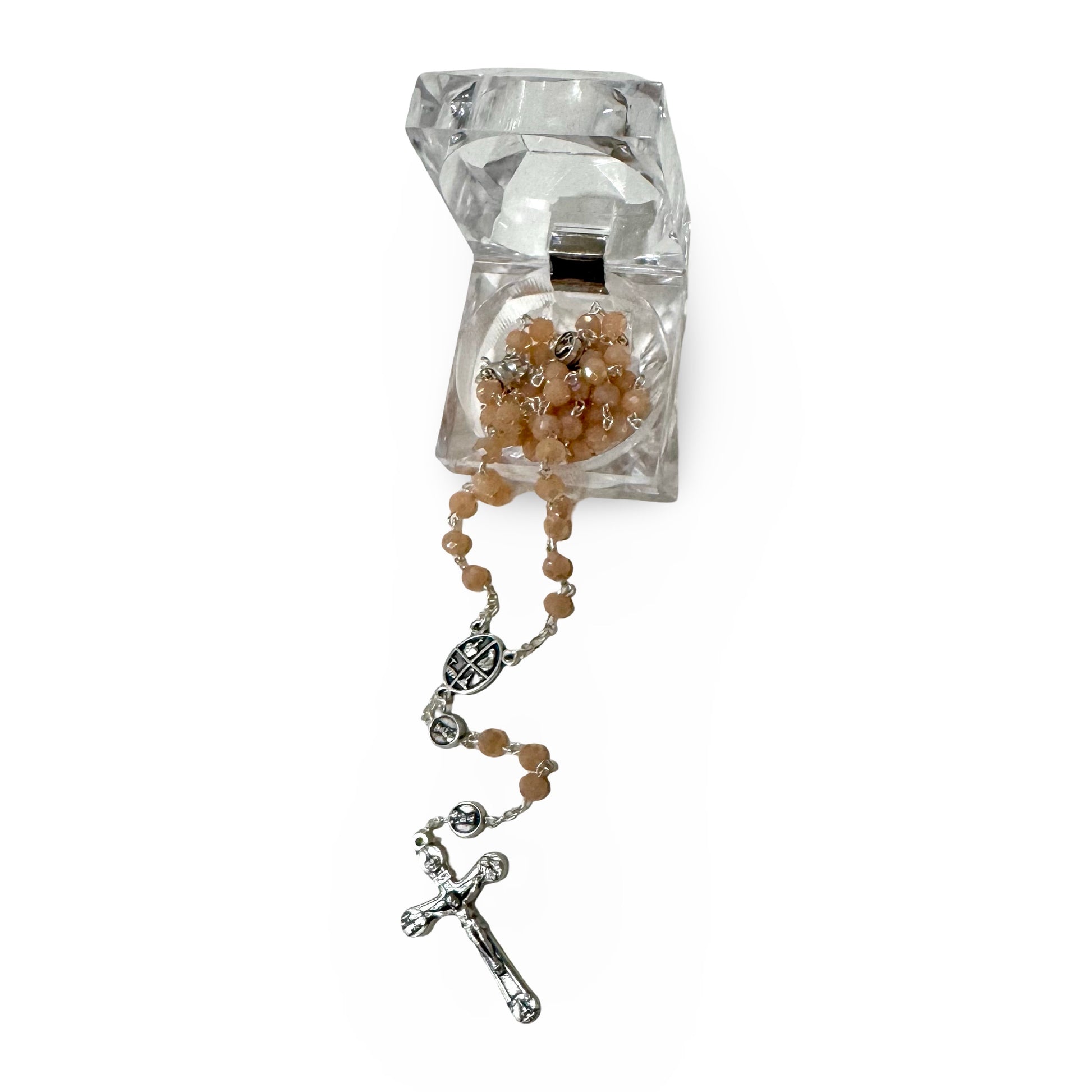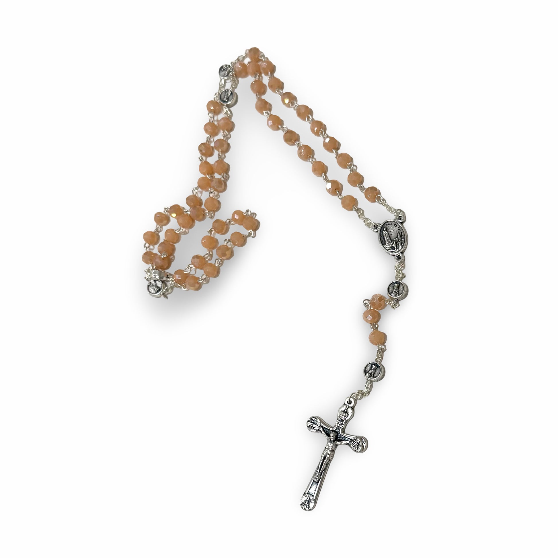 This rosary comes in the three colors of peach, sky blue and crystal and is packaged in a beautiful clear case. Additionally, the rosary is very unique as it features a medal with an image of our Lady of Fatima on each of the our father beads. This rosary can be used to spread devotion to our Lady, especially to Her Immaculate Heart.