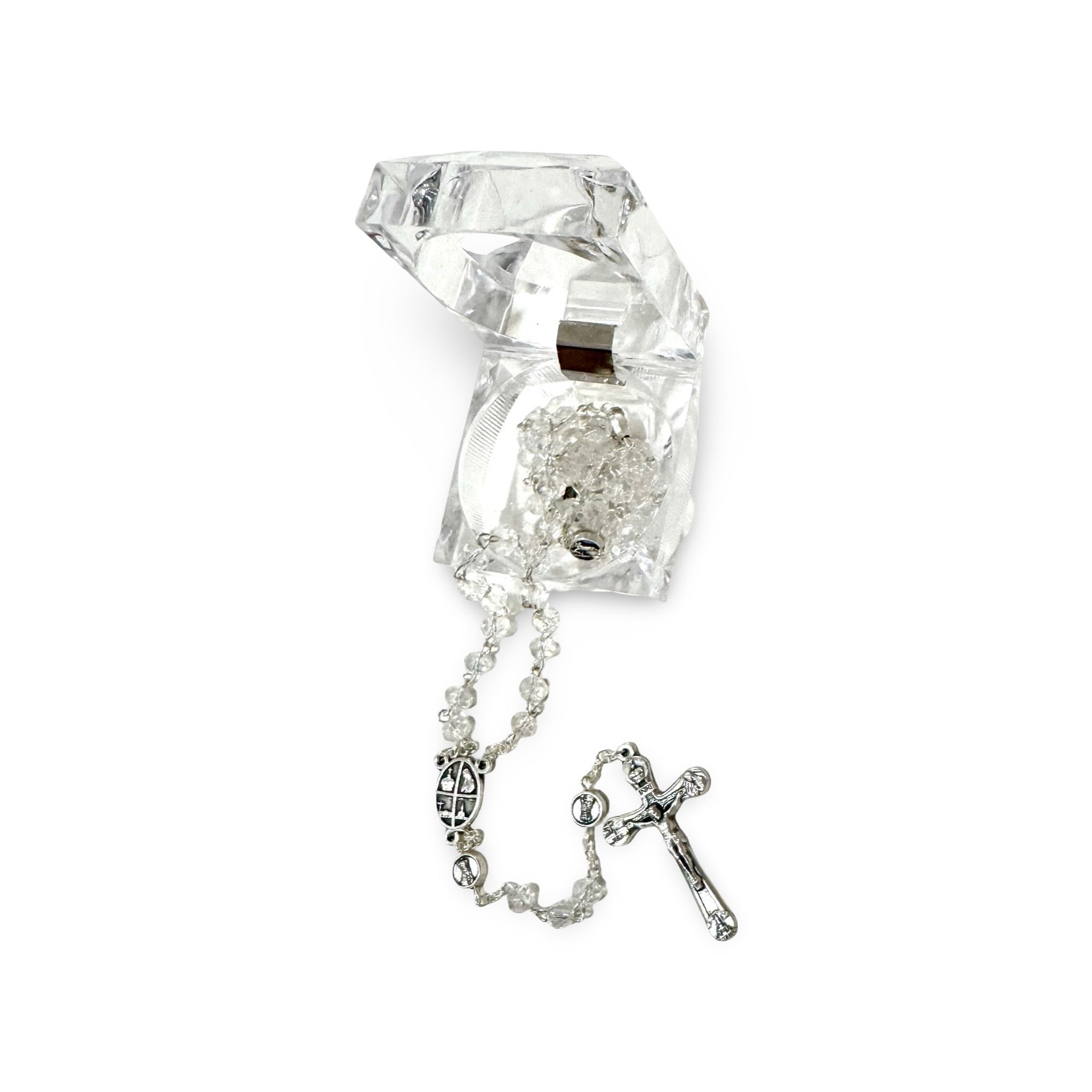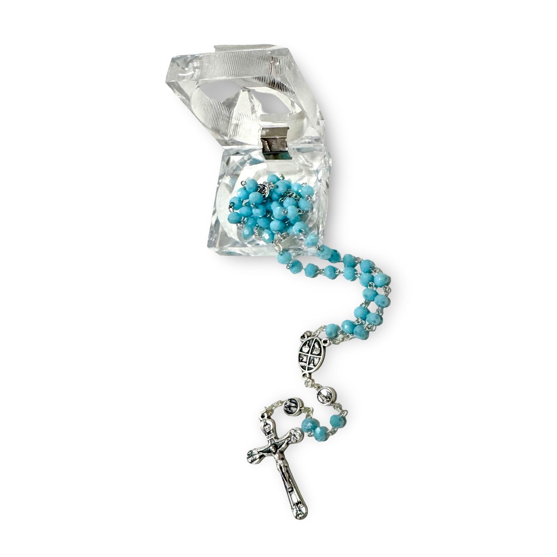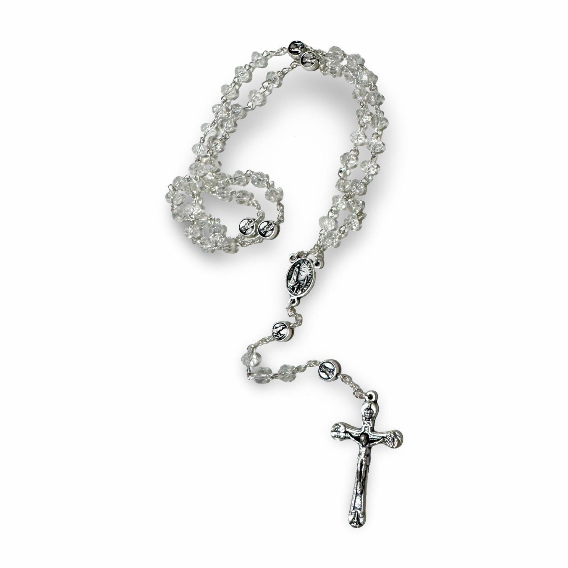 This rosary comes in the three colors of peach, sky blue and crystal and is packaged in a beautiful clear case. Additionally, the rosary is very unique as it features a medal with an image of our Lady of Fatima on each of the our father beads. This rosary can be used to spread devotion to our Lady, especially to Her Immaculate Heart.
