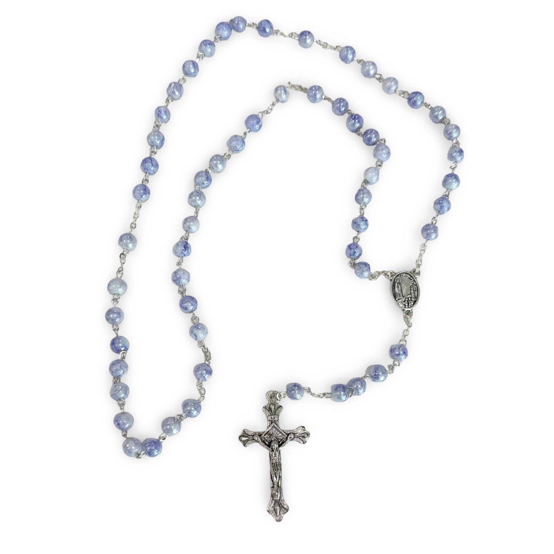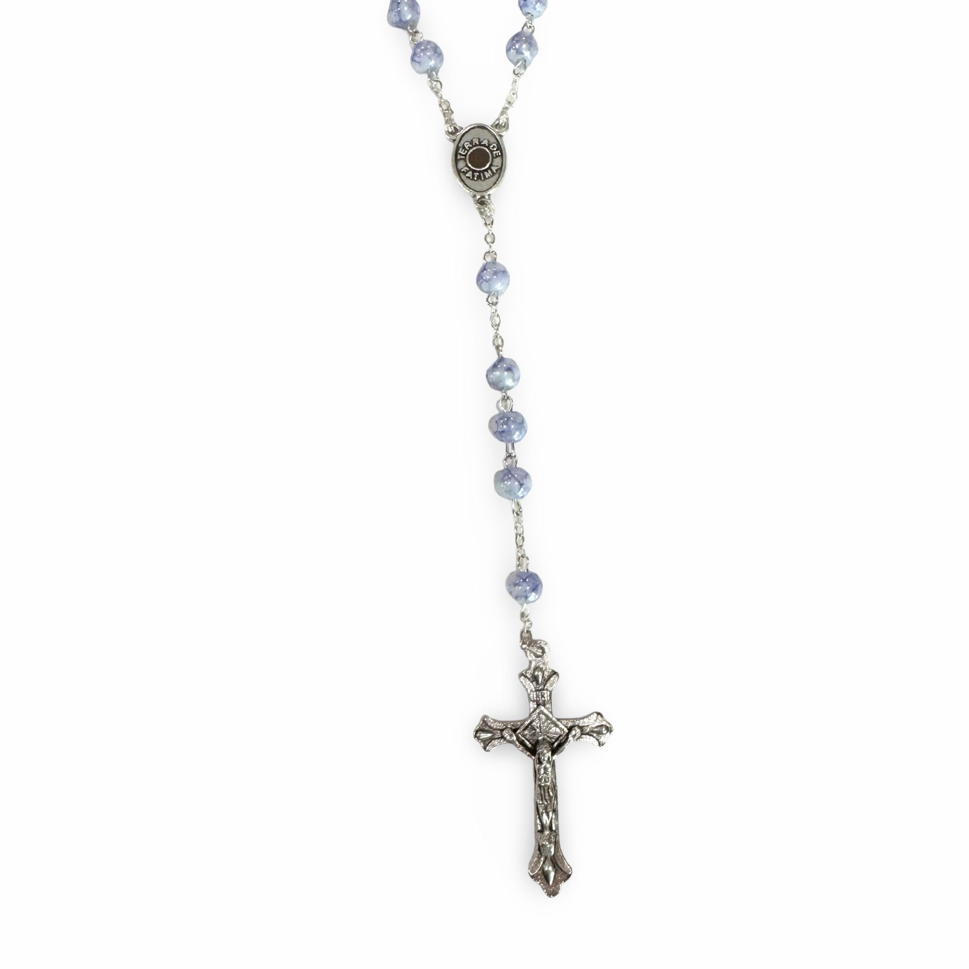 This elegant rosary has blue marble beads and a silver crucifix from Fatima. The silver center piece has an image of the apparitions of Our Lady of Fatima and soil from Fatima, Portugal.