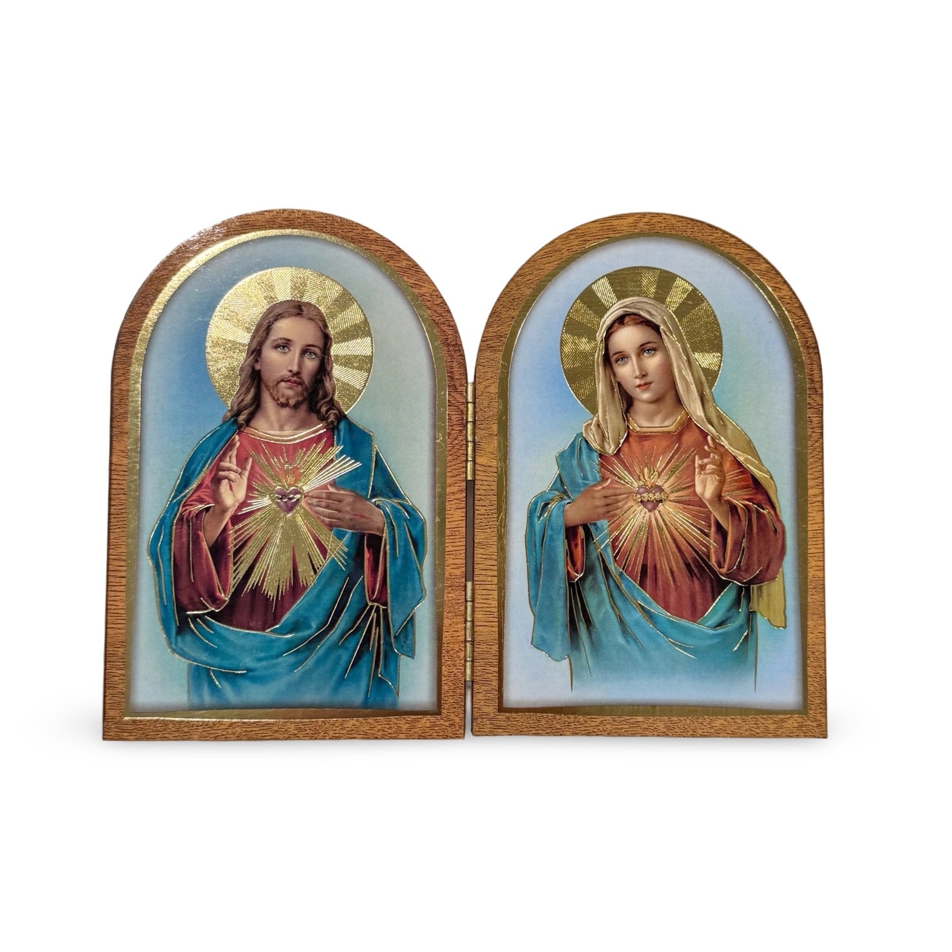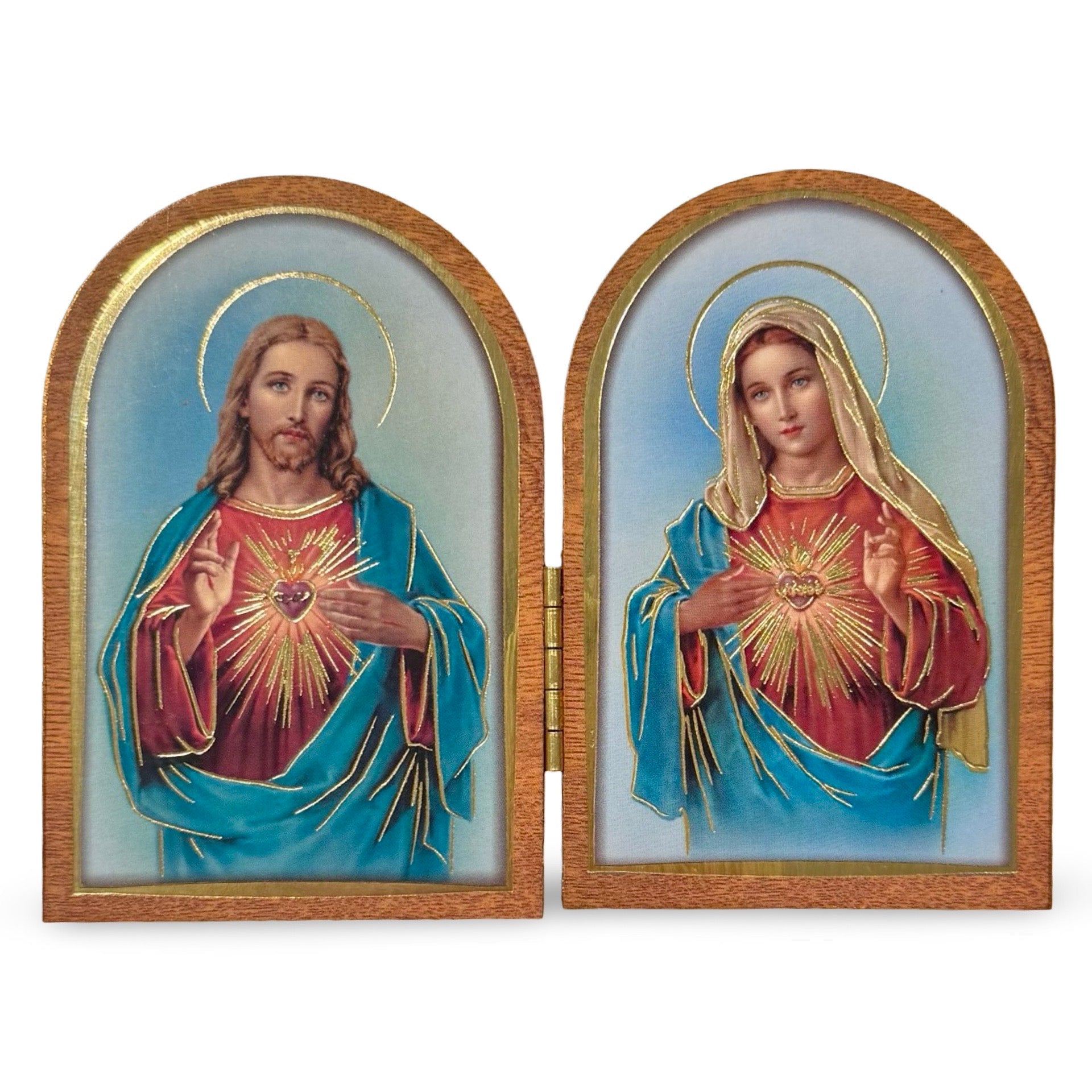 These unique images featuring the Two Hearts of Jesus and Mary are decorated with radiant golden accents to draw your gaze to Their Hearts filled with so much love for humanity. These images are joined together with a hinge as a simply of Their Hearts always being united as one.