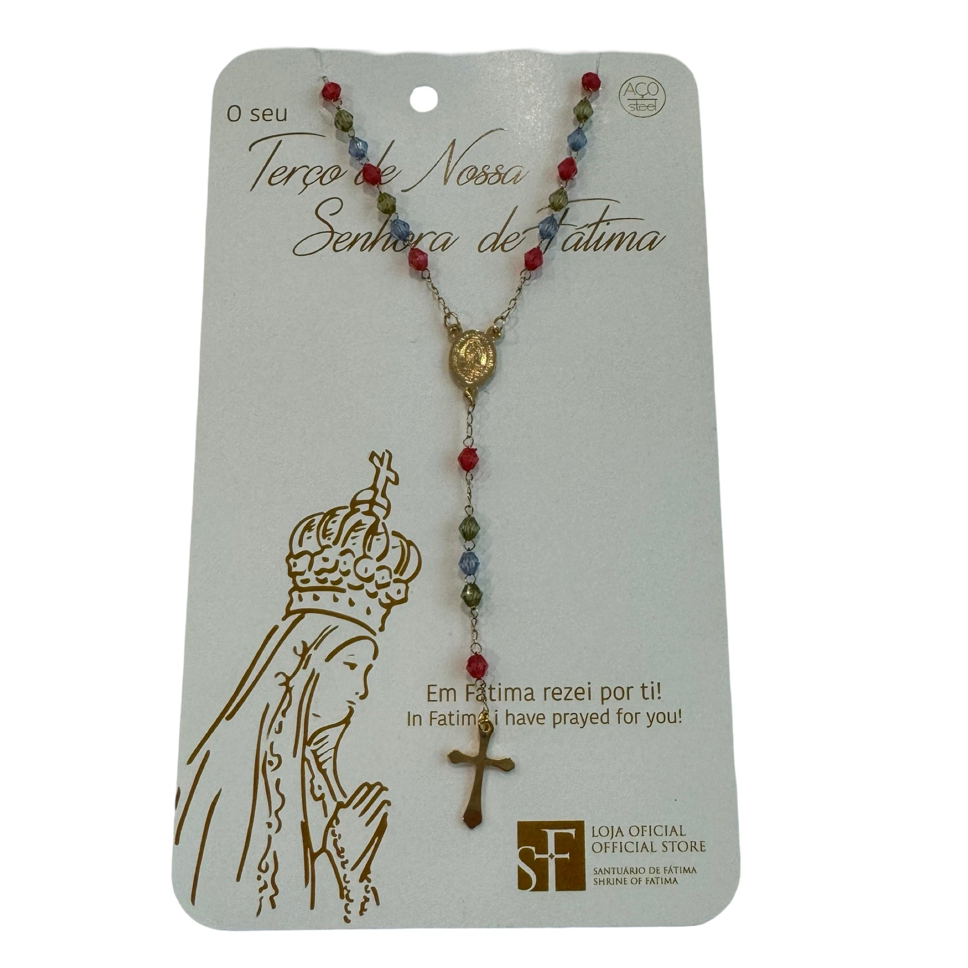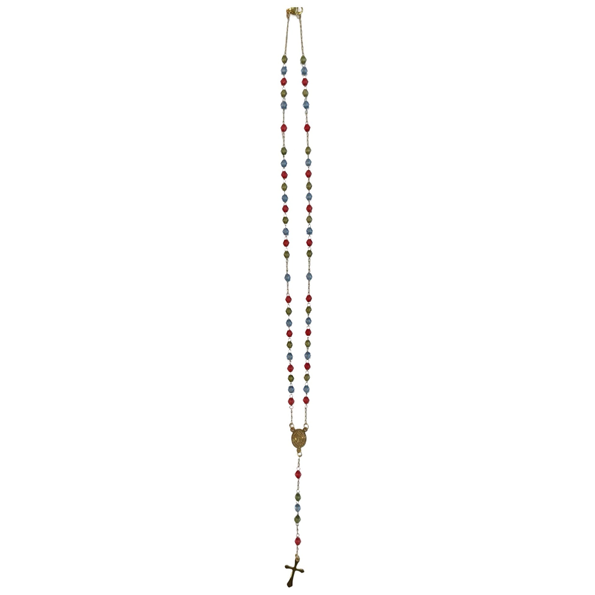 This delicate gold rosary necklace has crystal beads in pink, green, and blue, joined by a gold Miraculous Medal. With a clasp in back, it is easy to take on and off.