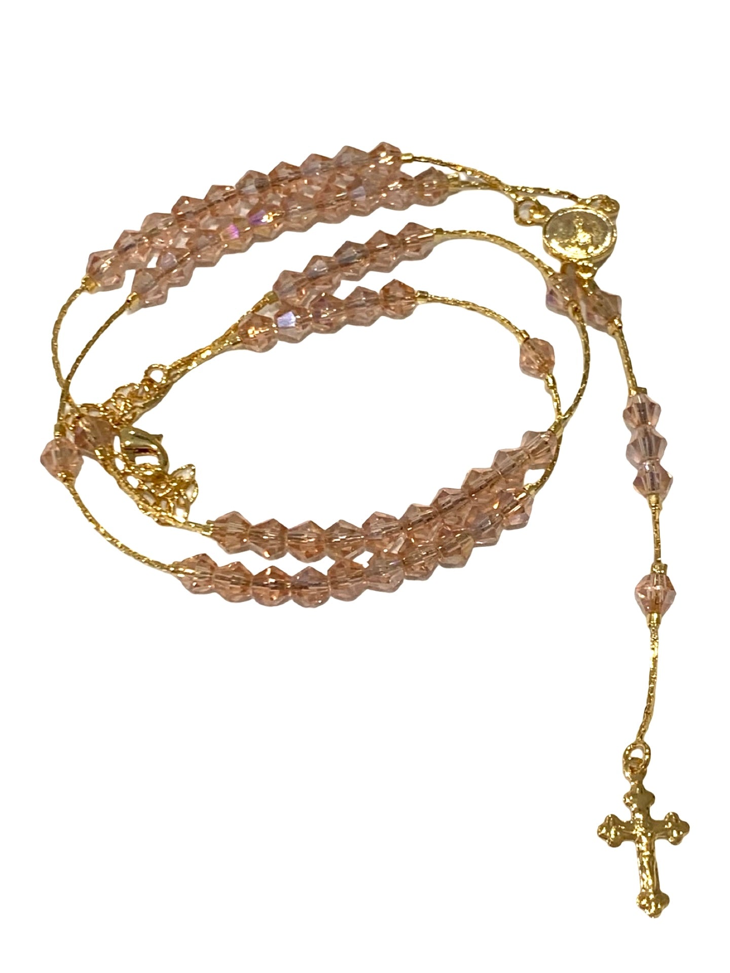 This delicate gold and crystal rosary necklace comes in a white framed display case. Given it's unique design, it would make a wonderful gift! May it remind us to pray the rosary everyday!