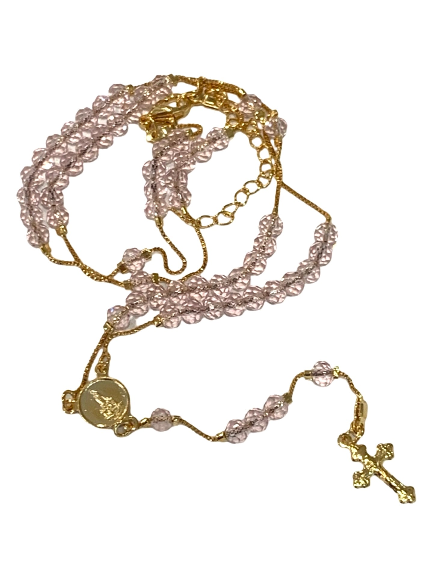 Gold and Pink Crystal Rosary Necklace in Framed Display Case