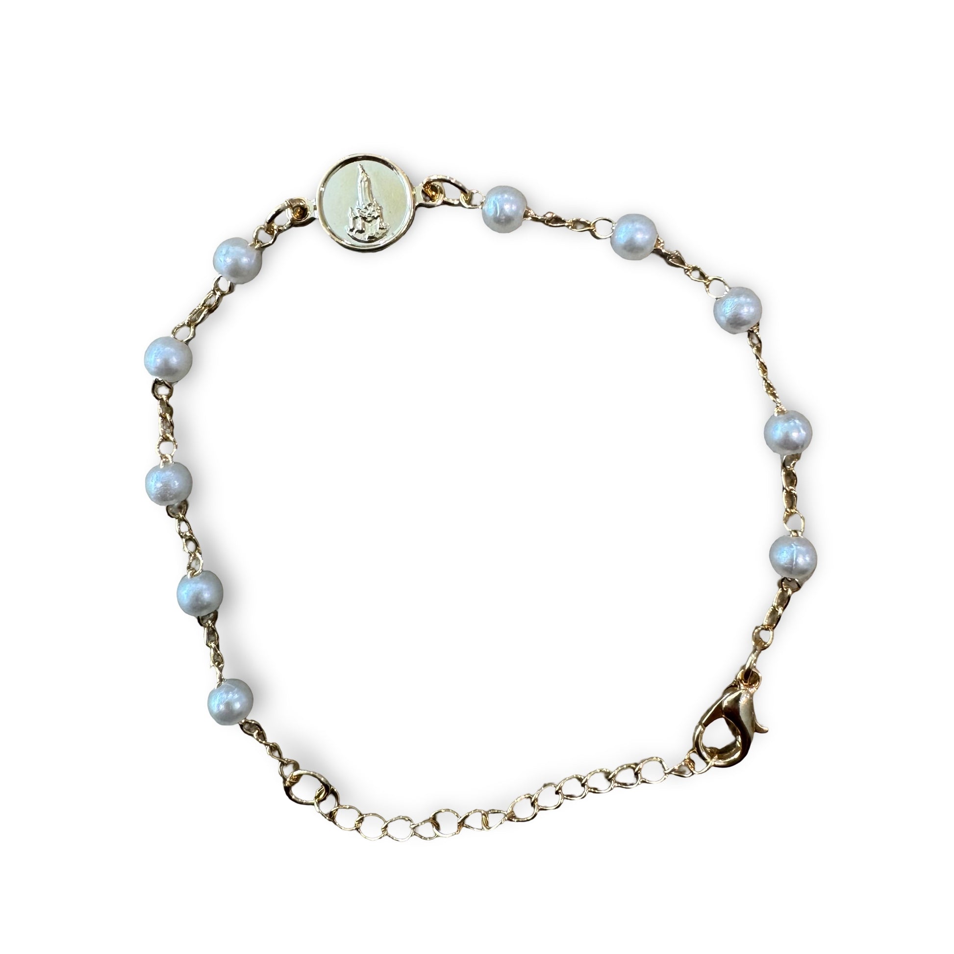 This gold and pearl decade rosary bracelet comes from the heart of the Shrine of Our Lady of Fatima. At its center, it showcases a refined depiction of Our Lady of Fatima alongside the three shepherd children. Ideal for both formal events and everyday wear.
