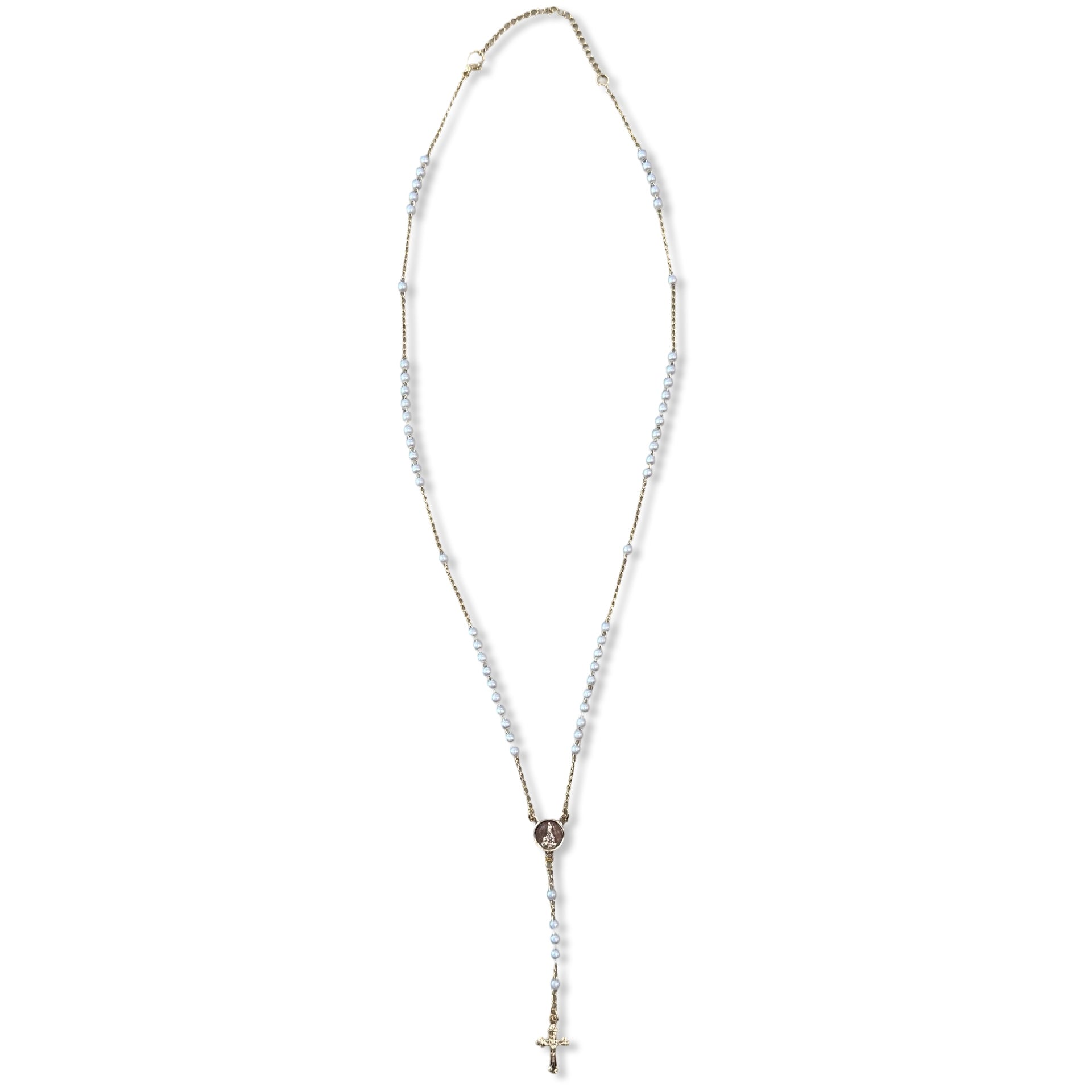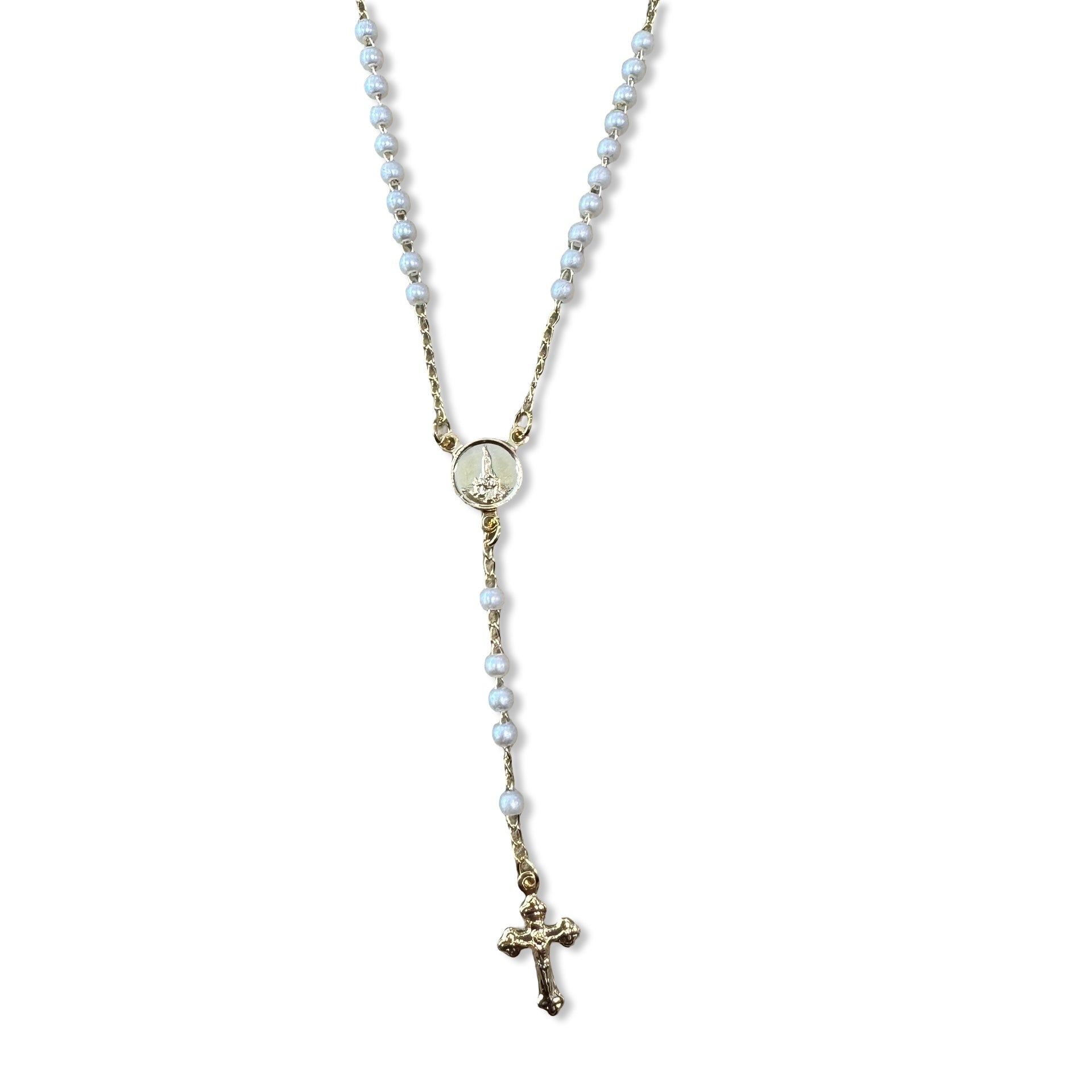 This gold and pearl rosary necklace comes from the heart of the Shrine of Our Lady of Fatima. At its center, it showcases a refined depiction of Our Lady of Fatima alongside the three shepherd children. A delicate cross hangs beneath, completing the design. Ideal for both formal events and everyday wear.