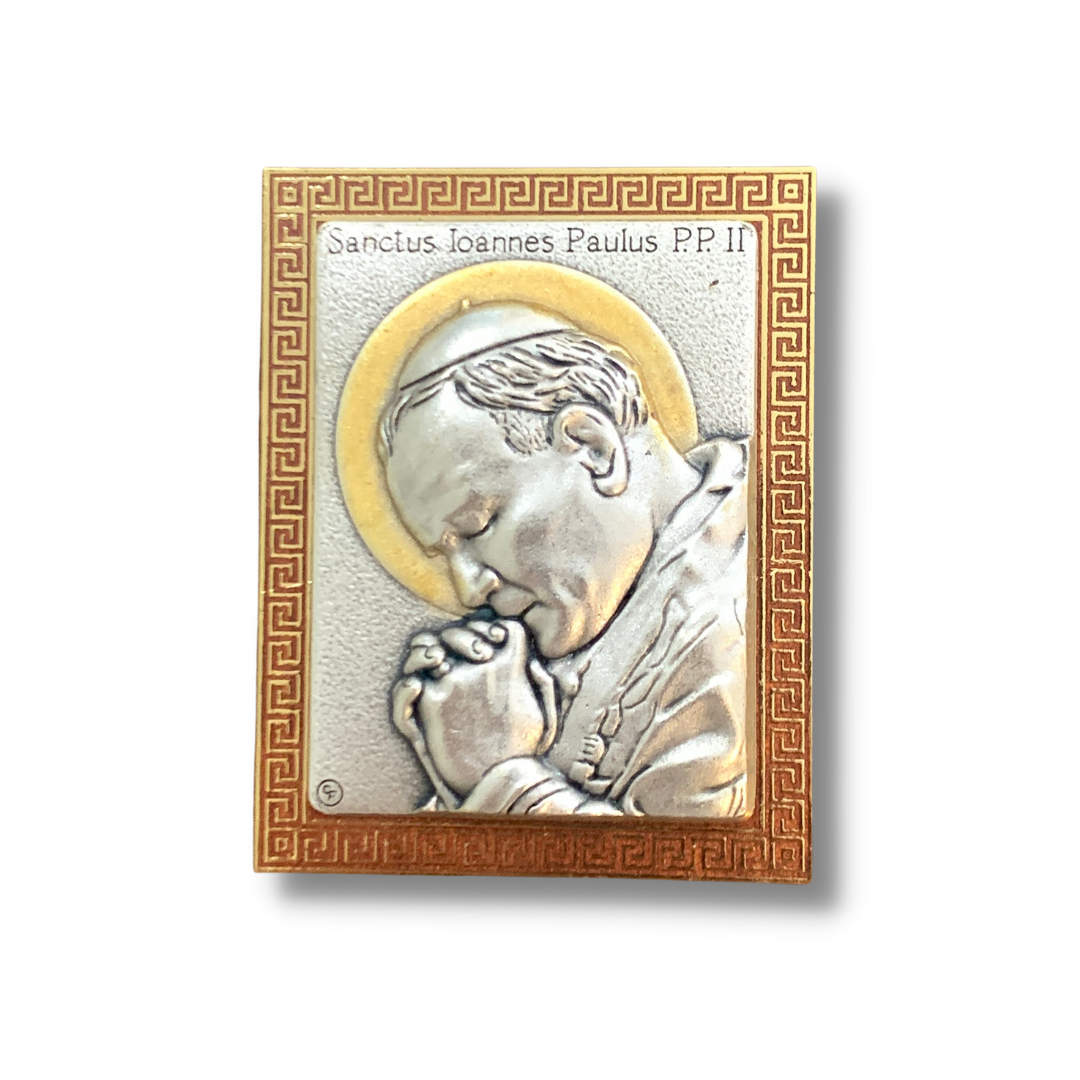 A colored silver image of St. John Paul II is an elegant addition to any home or office as a loving reminder of his rich Magisterium. This image is accompanied by a removable metal footing to be stood on tables and bookshelves, as well as mounted on walls.