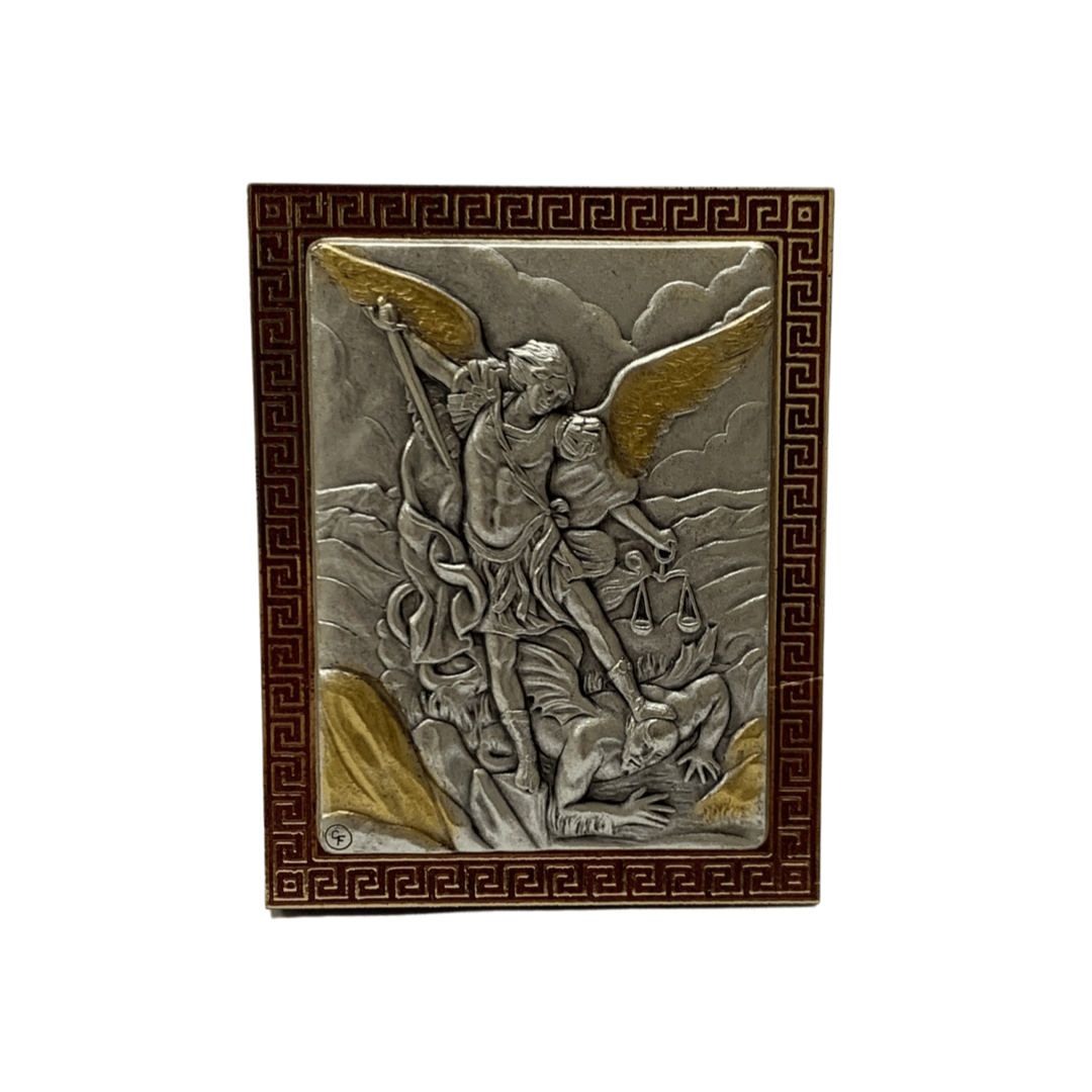 A gold colored silver image of St. Michael is an elegant addition to any home and a constant assurance of his spiritual protection. This image is accompanied by a removable metal footing to be stood on tables and bookshelves.