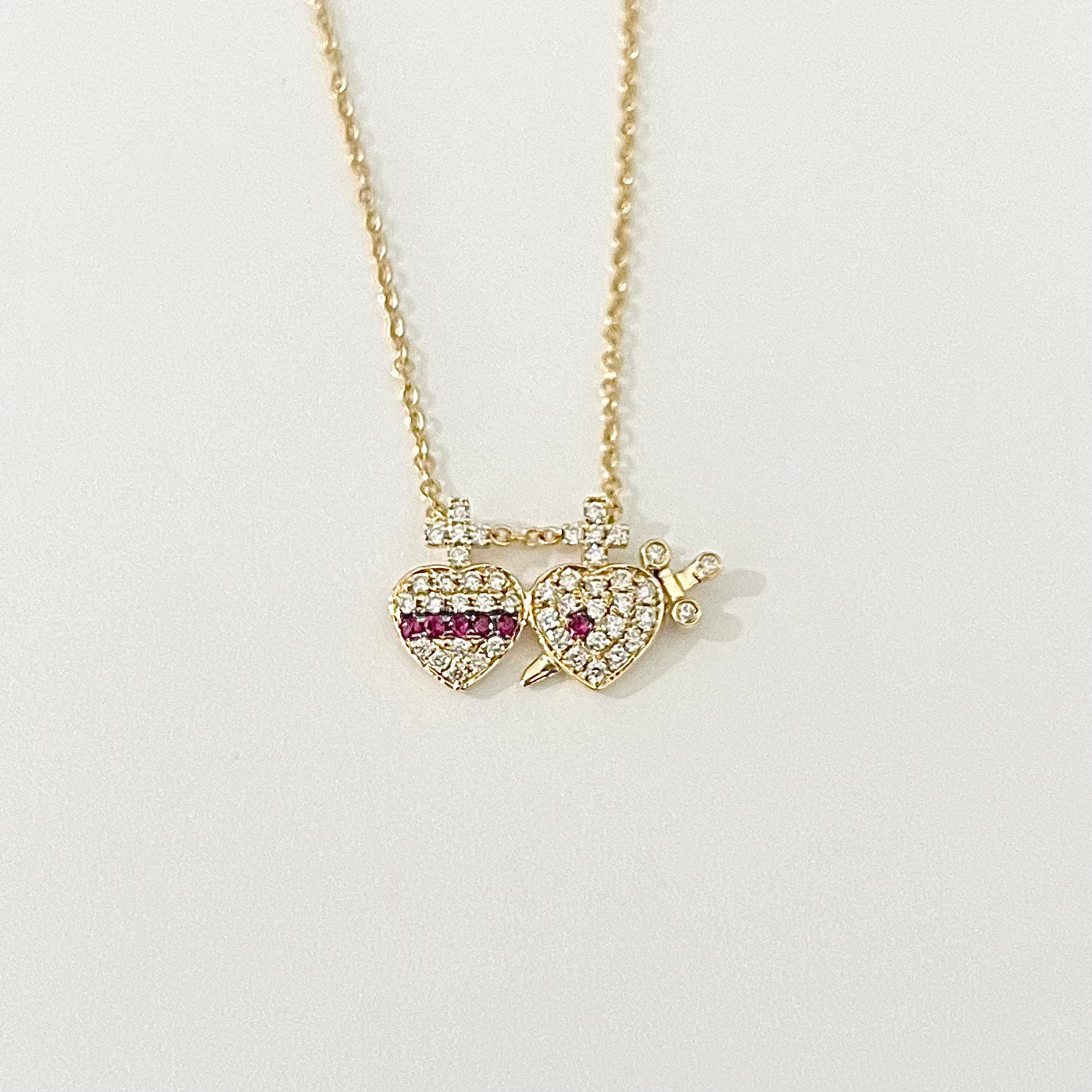 This elegant scapular necklace is composed of 14 karat gold. The gems are made up of diamonds and rubies.