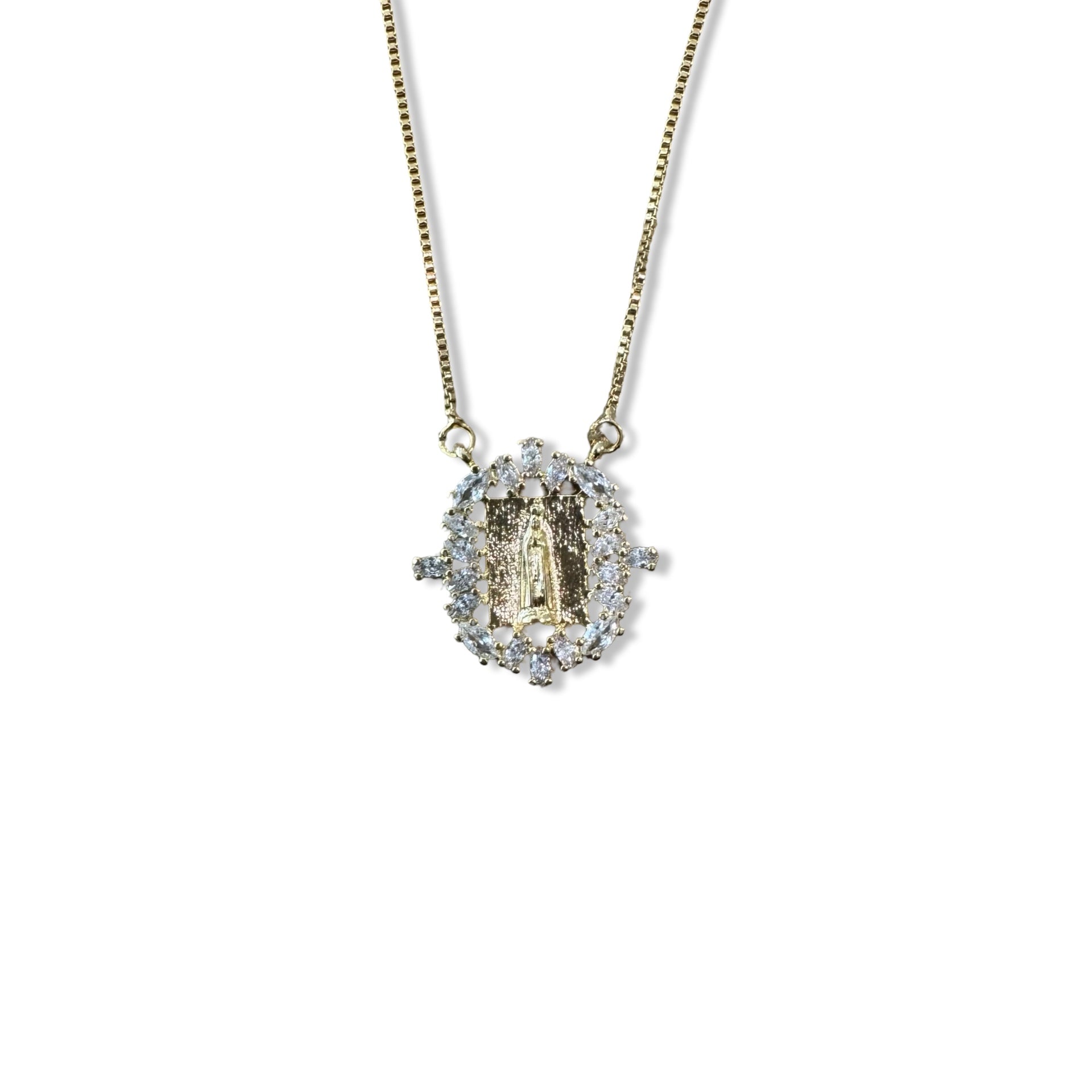This exquisitely crafted Gold Fatima Necklace captures the profound devotion and grace associated with the Blessed Mother. Originating from the heart of Fatima, Portugal, this necklace features intricate detailing that honors the spiritual significance of Our Lady of Fatima with an radiant rhinestone boarder. Its elegant gold finish adds a timeless sophistication, making it a meaningful accessory for daily wear or special occasions.