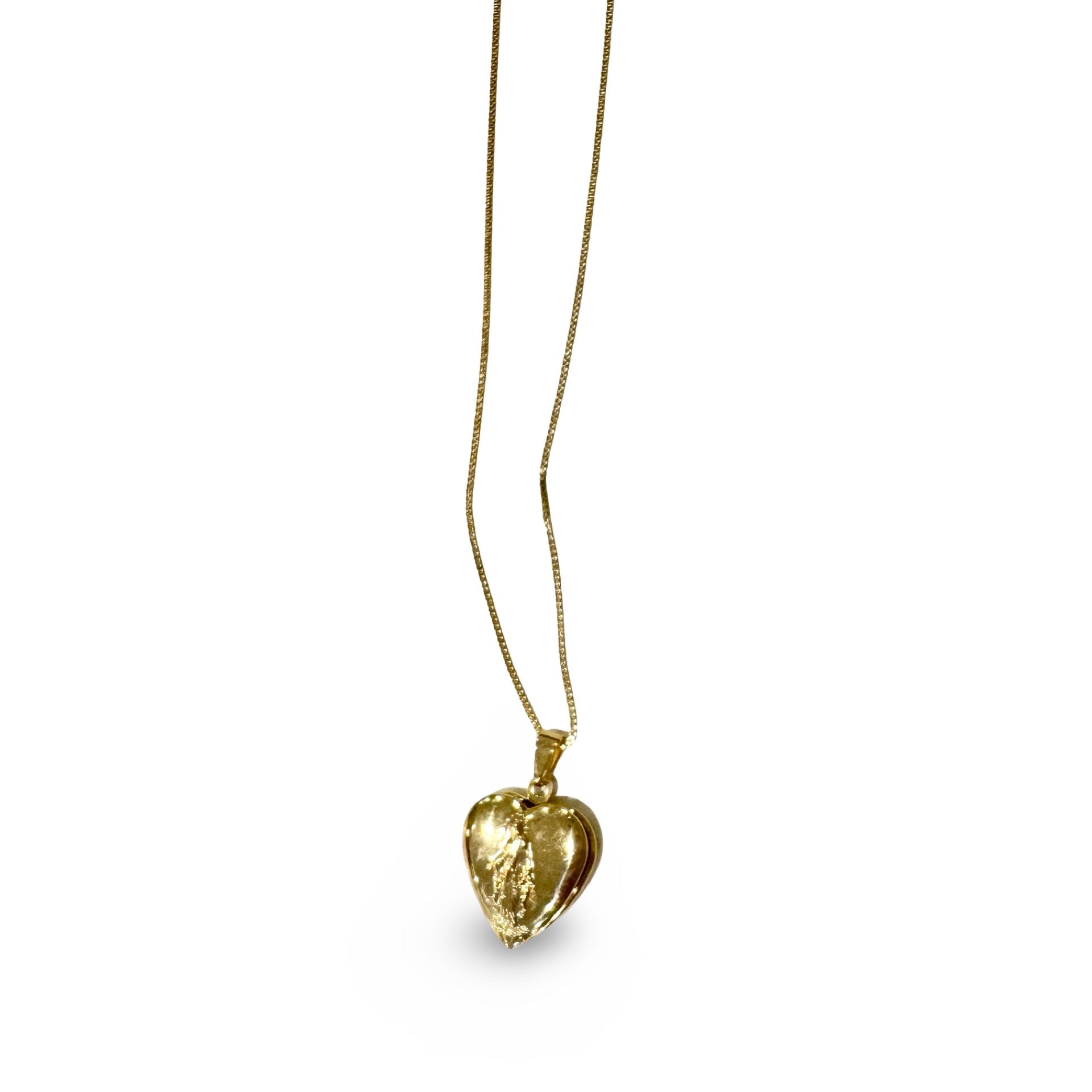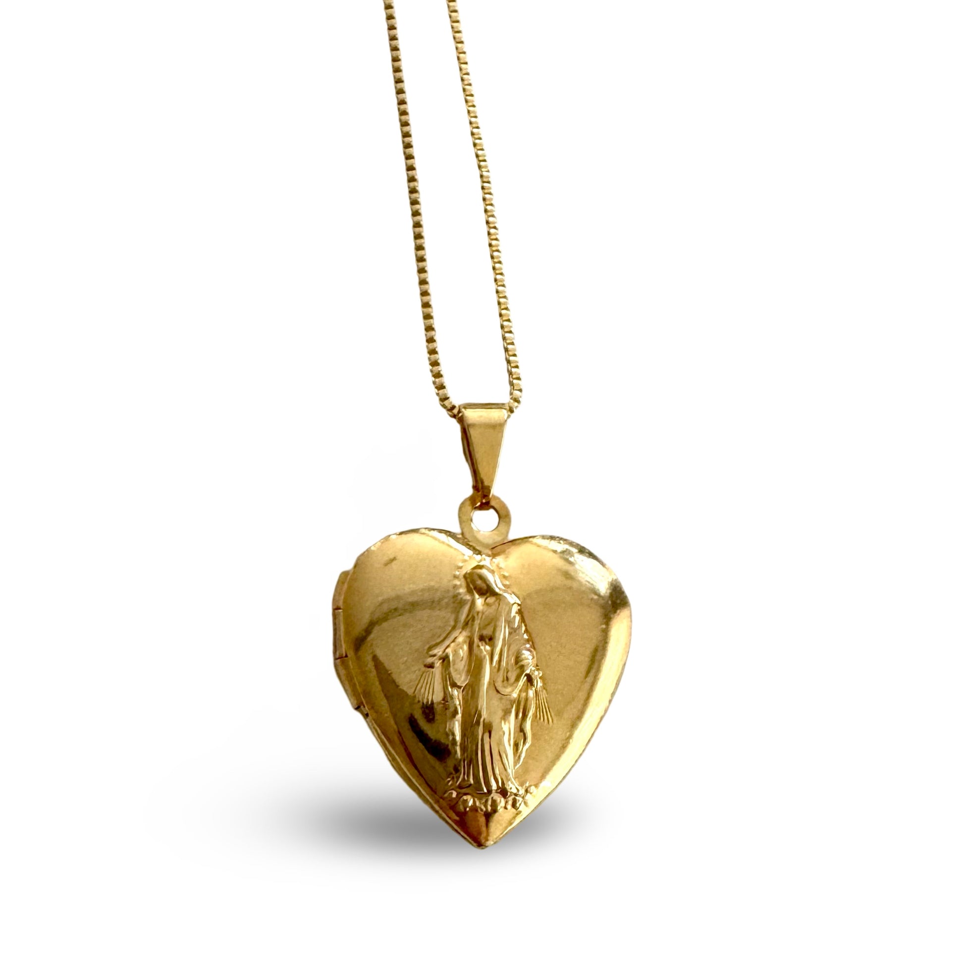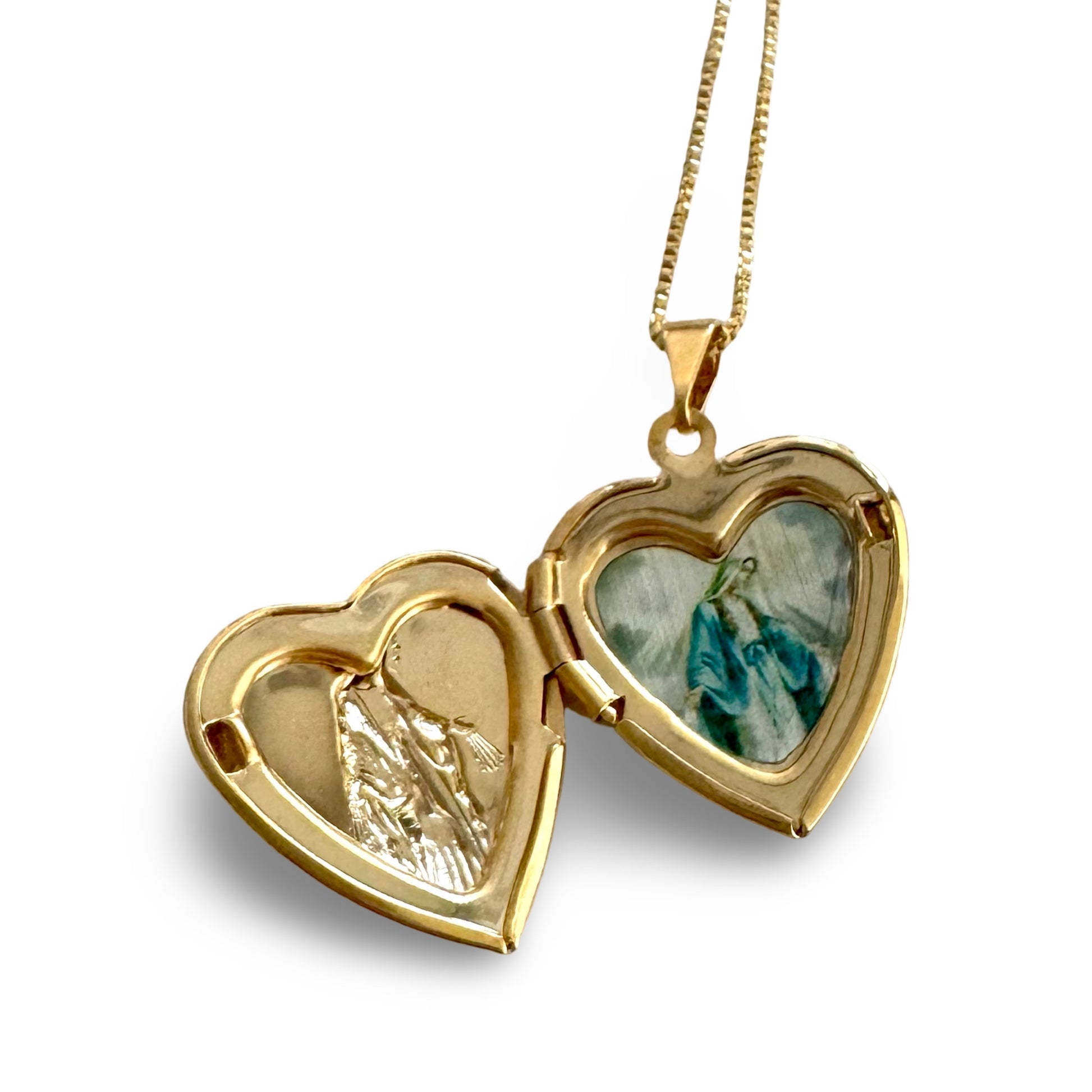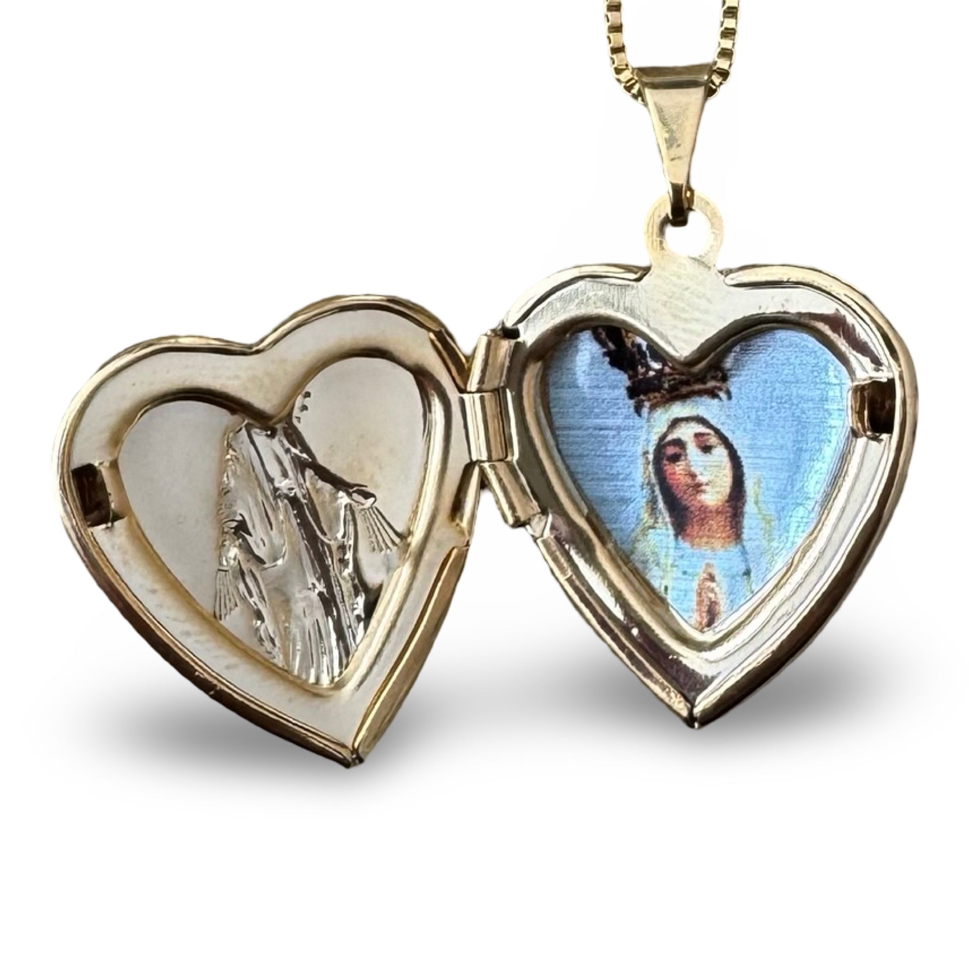 This elegant gold heart-shaped locket showcases a beautiful engraved image of Our Lady of Grace on its front. Inside, it holds a picture of Our Lady of Fatima or Our Lady of the Miraculous Medal. It is brought with love all the way from Fatima, Portugal by our Mother Foundress, Mother Adela Galindo.