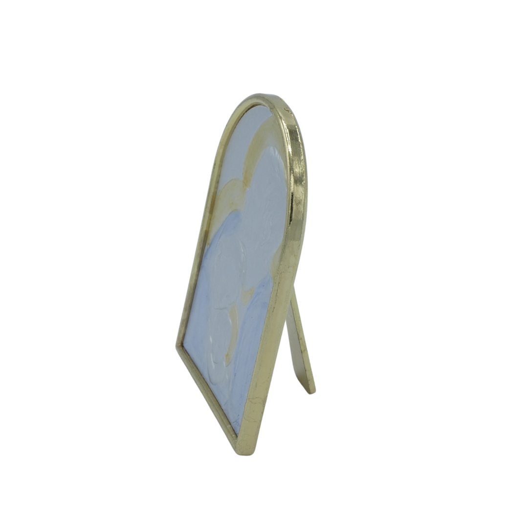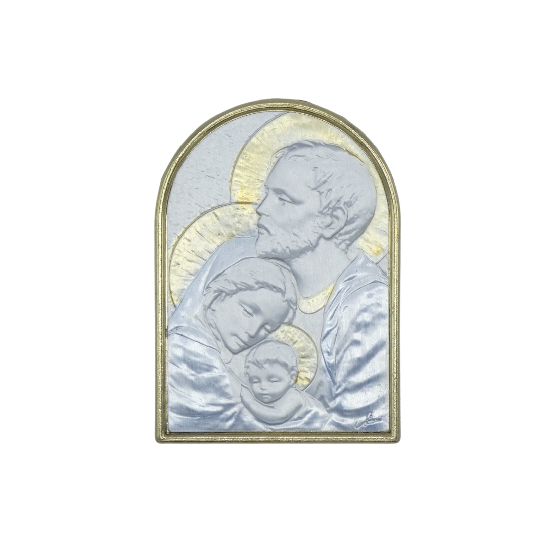 An arched colored silver image of the Holy Family is an elegant addition to any home and a daily reminder of the perfection of family life. This image is accompanied by a removable metal footing to be stood on tables and bookshelves. This product is brought with love by our Sisters serving the Heart of the Church in Rome, Italy!