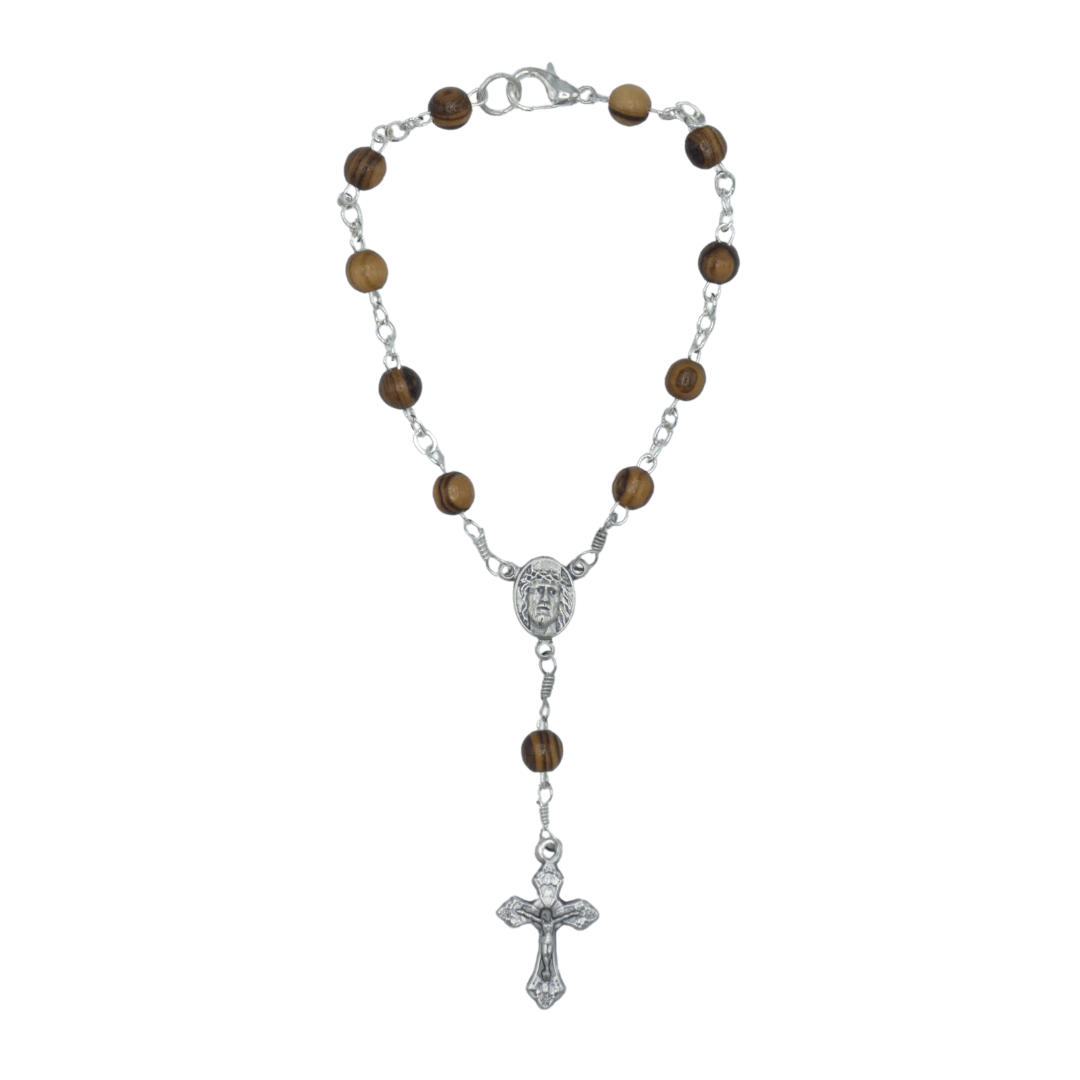 A genuine olive wood decade rosary with medal links and a small medal of the Face of Jesus wearing the crown of thorns. This decade rosary also includes a clasp, making it easily wearable. Our Lady is a mother to us all and this decade rosary draws us to her maternal love as we offer prayers to console the Heart of Her Son. This decade rosary, coming from the land where Our Lord lived and died, is perfect as a gift or for yourself to offer prayers for your family, your friends, and the entire world. This decade rosary comes all the way from the Holy Land and is brought by Mother Adela, Foundress SCTJM, when she leads pilgrimages.
